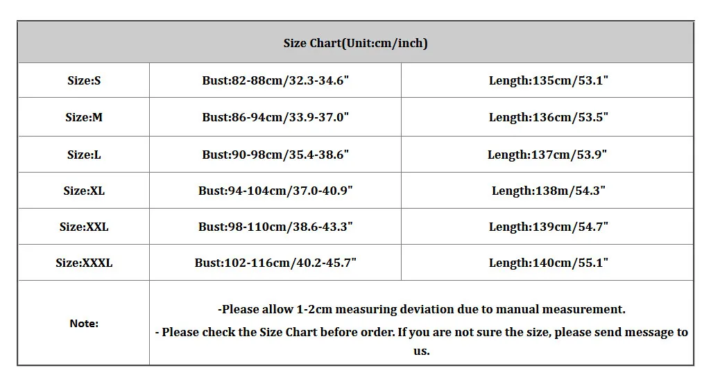 | Примечание: | -Возможны отклонения в 1-2 см вследствие измерений вручную. -Пожалуйста, проверьтеТаблица размеровПрежде чем делать заказ. Если вы не уверены в размере, пожалуйста, отправьте нам сообщение. |