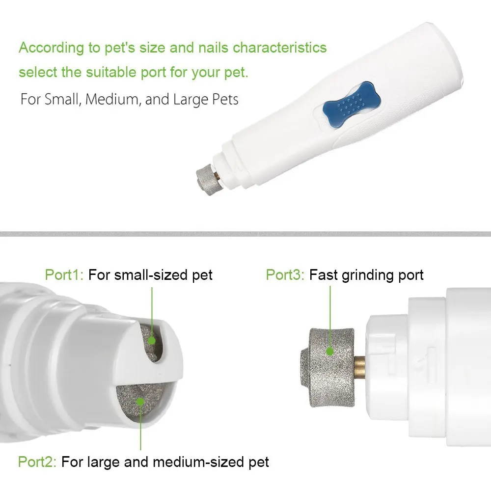 Шаг 1: Выберите подходящий порт для вашего питомца в соответствии с размерами и характеристиками ногтей. Порт 1 предназначен для маленьких домашних животных для измельчения ногтей; Порт 2 предназначен для средних и больших домашних животных; порт 3 (сбоку) предназначен для быстрого измельчения.