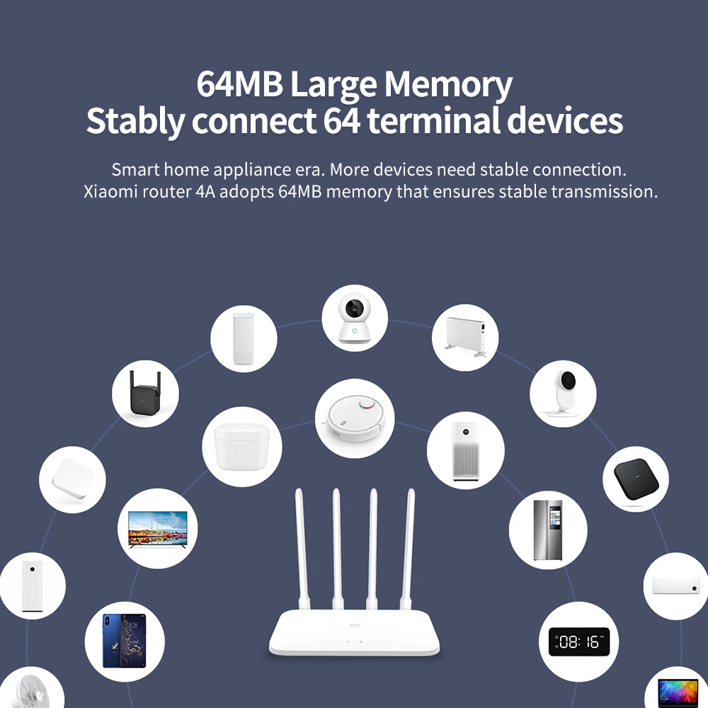 Маршрутизатор Xiaomi 4A имеет 4 антенны с высоким коэффициентом усиления. 64 Мб большой объем памяти и 1167 Мбит/с обеспечивают высокую производительность. Умное управление через приложение может эффективно предотвратить сдавливание Wi-Fi. Это абсолютно превосходный выбор для вас.