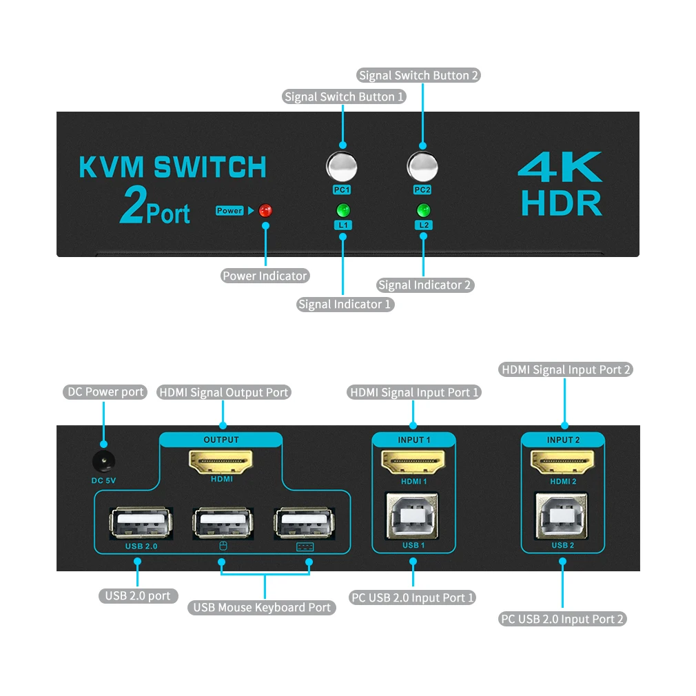 【 2 порта KVM переключатель с 2,0 HUB】-2-портовый USB Hdmi переключатель поддерживает 2,0 USB HUD порт, 2 в 1 выход USB kvm переключатель между двумя компьютерами, чтобы поделиться одним HDMI совместимым монитором дисплея и одним принтером, сканером, проектором, Bluetooth Беспроводная клавиатура и мышь без постоянного обмена кабелями или установки сложного программного обеспечения для совместного использования сети очень прост в использовании. Подключи и работай, драйвер не нужен, лучший Kvm переключатель, чтобы сделать ваше рабочее пространство аккуратным и Эффективный