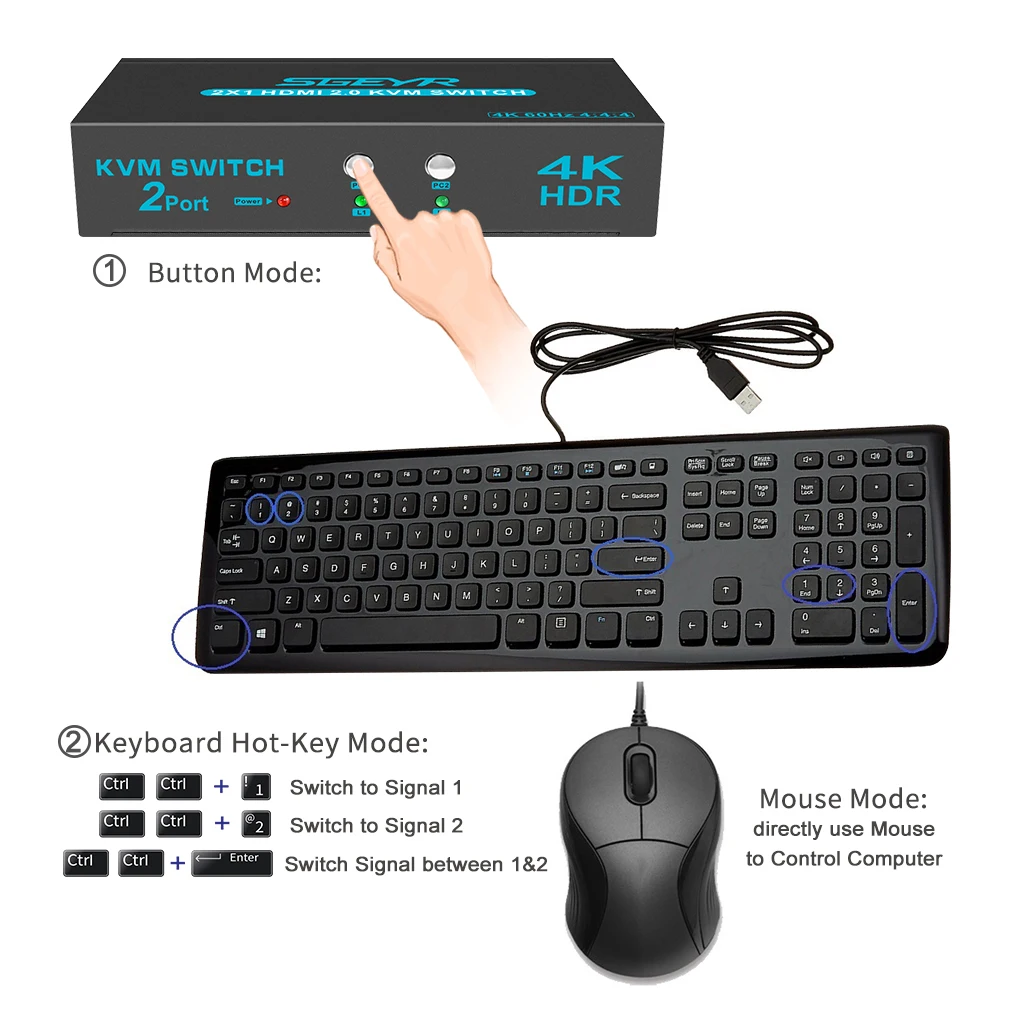 HDMI 2,0 KVM переключатель, SGEYR 2x1 USB 2 в 1 выход KVM Клавиатура Мышь Переключатель Поддержка 4:4:4 HDR 4K @ 60Hz 3D 1080P
