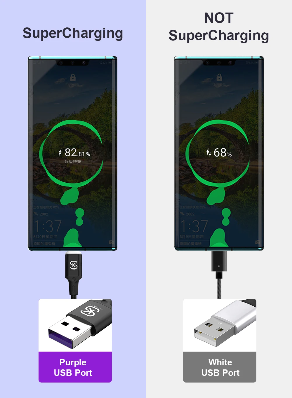 Супер быстрая зарядка 5A или Быстрая зарядка 3A Только для мобильных телефонов Huawei поддерживает супер быструю зарядку 5A Другие телефоны поддерживают быструю зарядку 3A (type c или micro) * Супер быстрое зарядное устройство 5A должно быть совместимо с оригинальной зарядкой huawei * Быстрая зарядка 3A должна быть совместима с зарядным устройством QC3.0