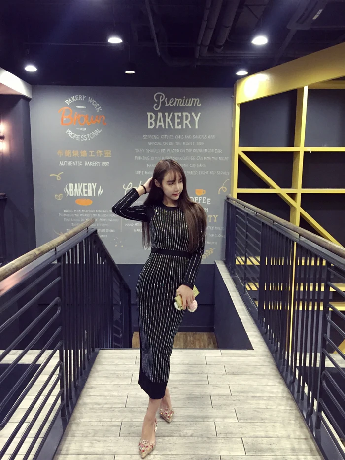 Высококачественное дизайнерское подиумное женское платье с длинным рукавом, стразы, украшенное стразами, Черное длинное платье DC866 <