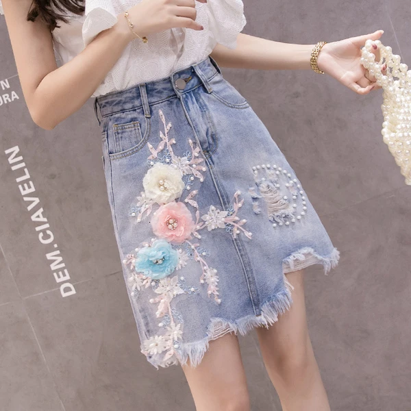 Джинсовая юбка с высокой талией для женщин 3D Цветочная вышивка 2019 летние Faldas