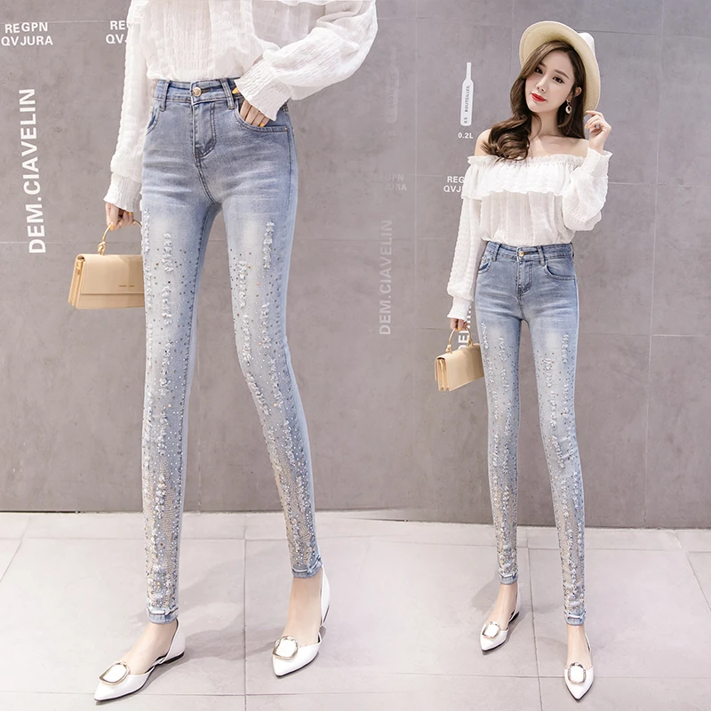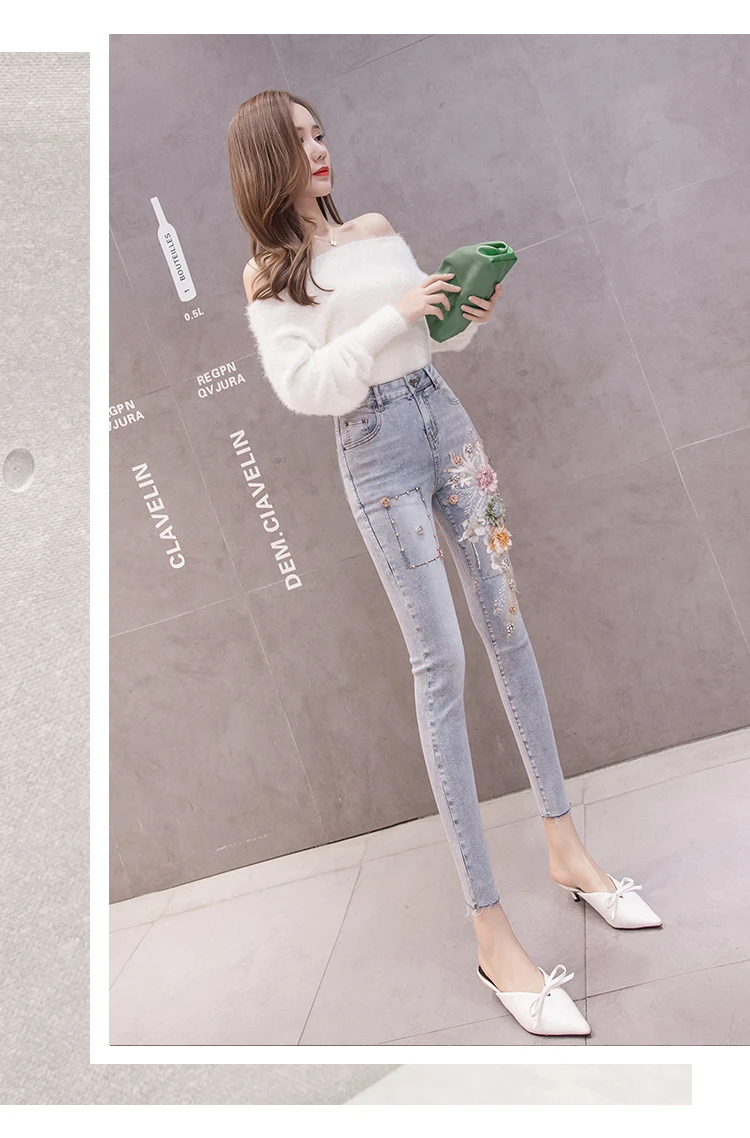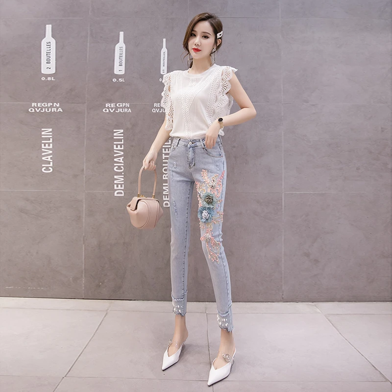 Женские брюки облегающие джинсы карандаши голубого цвета 2020 Лето 3D Цветочная
