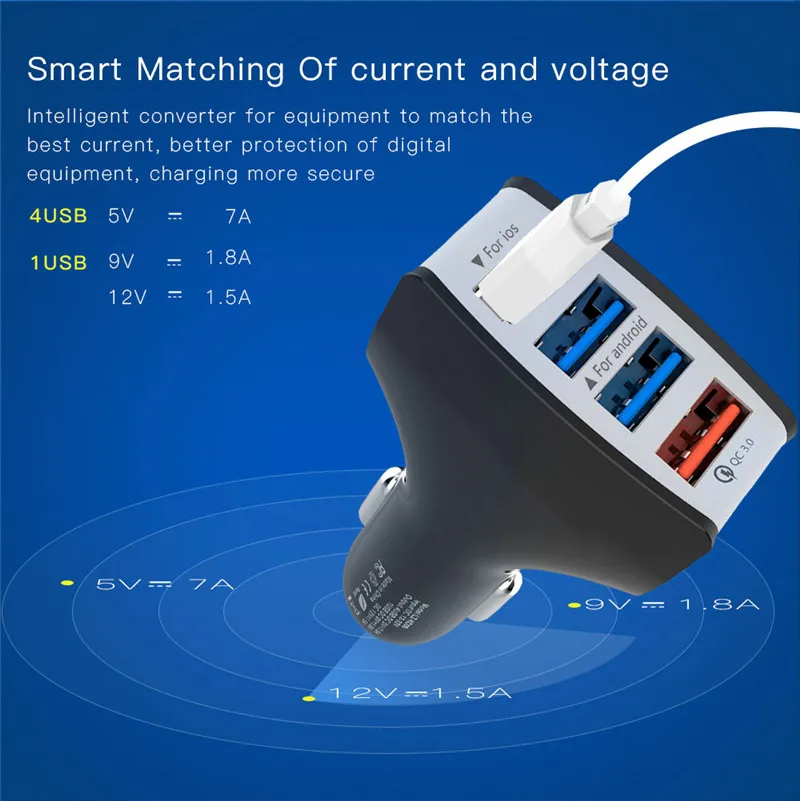 QC3.0 адаптер для быстрой зарядки телефона 4 порта USB Автомобильное зарядное устройство Быстрая умная Зарядка для Samsung Galaxy S7 Edge iPhone Xiaomi Универсальная зарядка: обратная совместимость со всеми версиями технологии быстрой зарядки Qualcomm (1,0, 2,0 и 3,0). Также совместим с USB-C и может обеспечить стандартную зарядку устройств без быстрой зарядки. Высокая эффективность Самая быстрая технология зарядки, на 38% более эффективная, чем Быстрая зарядка 2,0. И большая эффективность делает меньше тепла при зарядке. Гарантия безопасной зарядки Устройство с поддержкой Quick Charge 3,0 должно быть сопряжено с адаптером с сертификацией Quick Charge 3,0; множественные встроенные гарантии защищают от перегрузки по току, перезарядки и перегрева для безопасной и быстрой зарядки. Совместимые устройства Quick Charge 3,0: HTC One A9; Samsung Galaxy S7/S7 Edge; LG G5; Xiaomi 5 и многое другое Совместимые устройства Quick Charge 2,0: -Samsung Galaxy S6, S6 Edge, Note 4/Edge -Google Nexus 6 -Sony Xperia Z4, Z4 Tablet, Z3, Z3 Compact, Z3 Tablet Compact, Z2 Tablet -Motorola Droid Turbo, Moto X 2014 -HTC One M9, HTC One (M8), One Remix (Verizon Mini 2), Desire EYE -LG G Flex2, G4 и многое другое В комплект входит: 1 автомобильное зарядное устройство (4 порта)