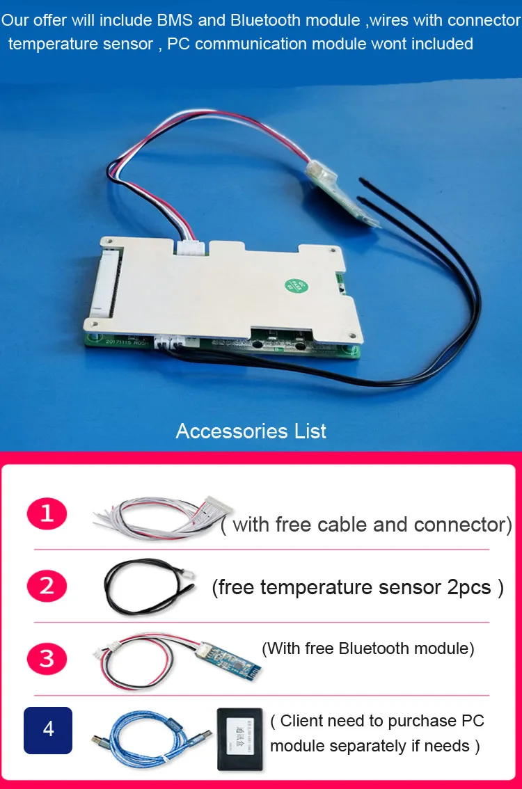 Наши умные BMS с функцией Bluetooth Включают Бесплатный модуль Bluetooth и соединительные кабели. Если клиенту нужен модуль связи ПК, вы можете купить его отдельно без проблем