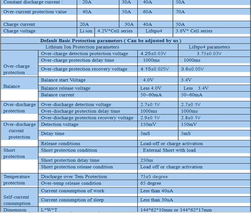 Описание и особенности: Это умная Защитная панель, специально разработанная для аккумуляторов. Она может быть применена к литиевым батареям с различными химическими свойствами, такими как литий-ионный, литий-полимерный. Литий-железо фосфат и т. Д. Защитная панель имеет сильную грузоподъемность и максимальный непрерывный ток разряда может достигать 60А. ● 12 ячеек серии защита для литиевой или Lifepo4 батареи (12*3,65 = 43,8 V Lifepo4 батареи и 12*4,2 = 50,4 V литий-ионный аккумулятор), клиент может выбрать подходящий тип на основе характеристик батареи ● Различные функции защиты для зарядки и разрядки (перезарядка, перезарядка, защита от высоких или низких температур, защита от перегрузки по току, защита от короткого замыкания и т. д.) С двухслойной защитой аппаратного и программного обеспечения. ● Точный расчет SOC с функцией SOC автоматического обучения ● Автоматическая зарядка аккумулятора или функция статического баланса для системы аккумулятора ● Оснащен модулем Bluetooth с изолированным UART, который может позволить пользователю просматривать информацию о батарее в нашем приложении или компьютерном программном обеспечении, которое может быть предоставлено нами. Клиент может использовать программное обеспечение ПК для гибкого определения параметров защиты ● С SW портом для управления выходом