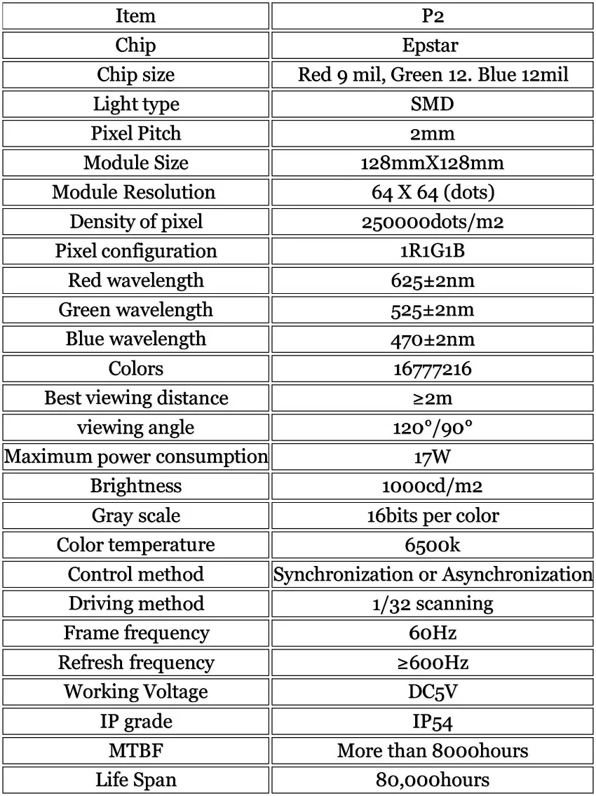 * 1 шт. P2 полноцветный светодиодный модуль * 1 шт. плоский ленточный кабель для передачи данных * 1 шт. кабель питания (если вы покупаете N шт., мы поставим N/2 шт. кабель питания, потому что 1 шт. кабель питания поддерживает 2 модуля)
