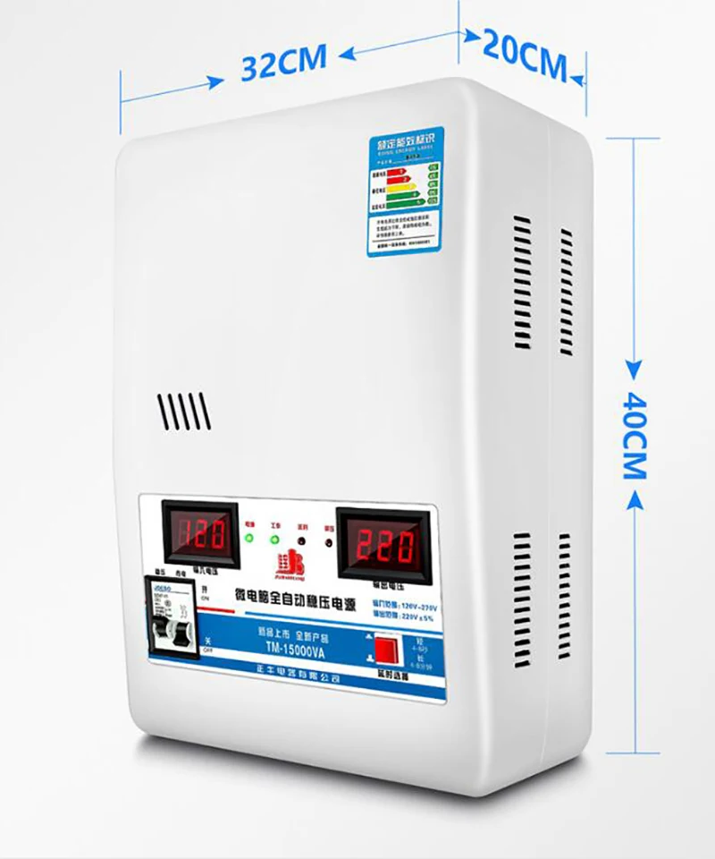 Название: Интеллектуальный регулятор напряжения Модель: TM-15000VA Эффективность: ≥ 95% Сопротивление изоляции: >2 м Мощность нагрузки: 0,9 Частота: 50-60 Гц Номинальная частота: 50 Гц Время задержки: 8S Время регулирования: <1 мин Выходное напряжение: 220V ± 5% Входное напряжение: 120-270 в