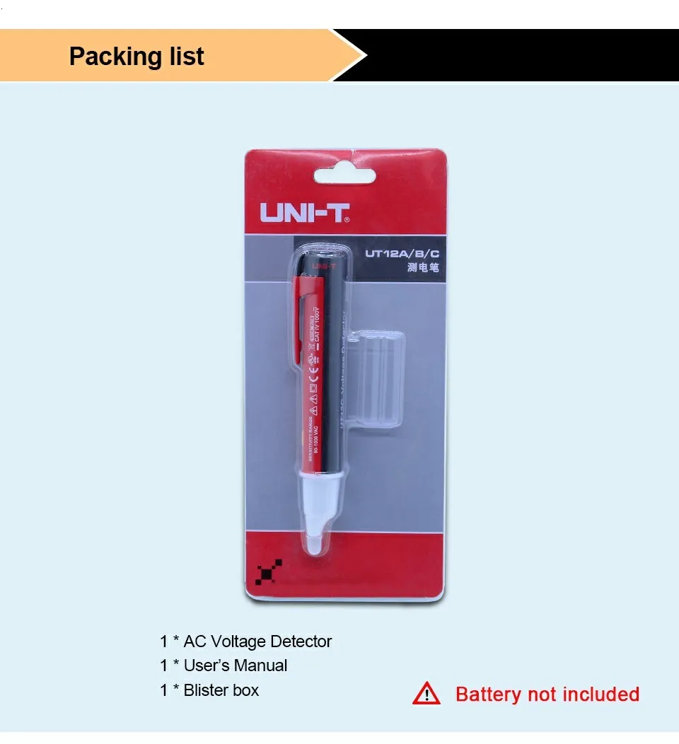 UT12 серия Бесконтактный детектор является усовершенствованным бесконтактным детектором напряжения переменного тока, сделанным UNI-T. Он может указывать на слухи, зрение и прикосновение. Он деликатный и легко носить с собой. Он может быть применен к дому, промышленности, электрическому Отделу, чтобы быстро определить, заряжается ли живая цепь на рабочем месте или дома.Диапазон напряжения переменного тока-90 В ~ 1000 В.