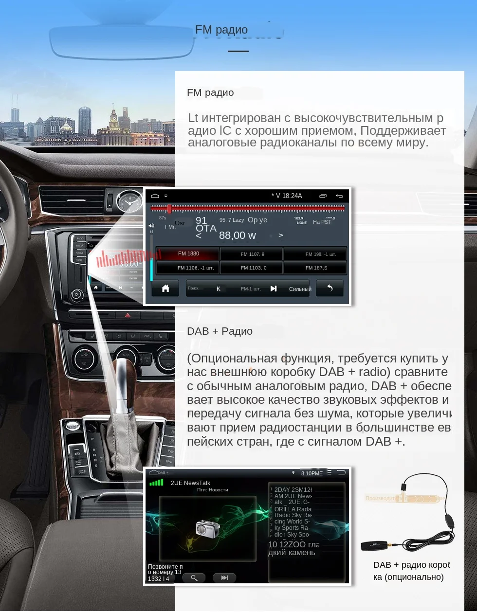 - DAB:Короткое для цифрового аудио вещания, DAB в качестве передовой цифровой радиотехнологии для вещания радиостанций объединяет ряд функций, чтобы уменьшить проблемы помех и Шум сигнала. С высоким качеством звука, он предлагает больше радиопрограмм по конкретному спектру, чем Аналоговое fm-радио. Кроме того, DAB может не только автоматически настроиться на все доступные станции, предлагая список для вас, но и предоставить информацию в реальном времени, такую как названия песен, тип музыки, новости или обновления трафика. Это лучший выбор для любителей радио и любителей музыки.