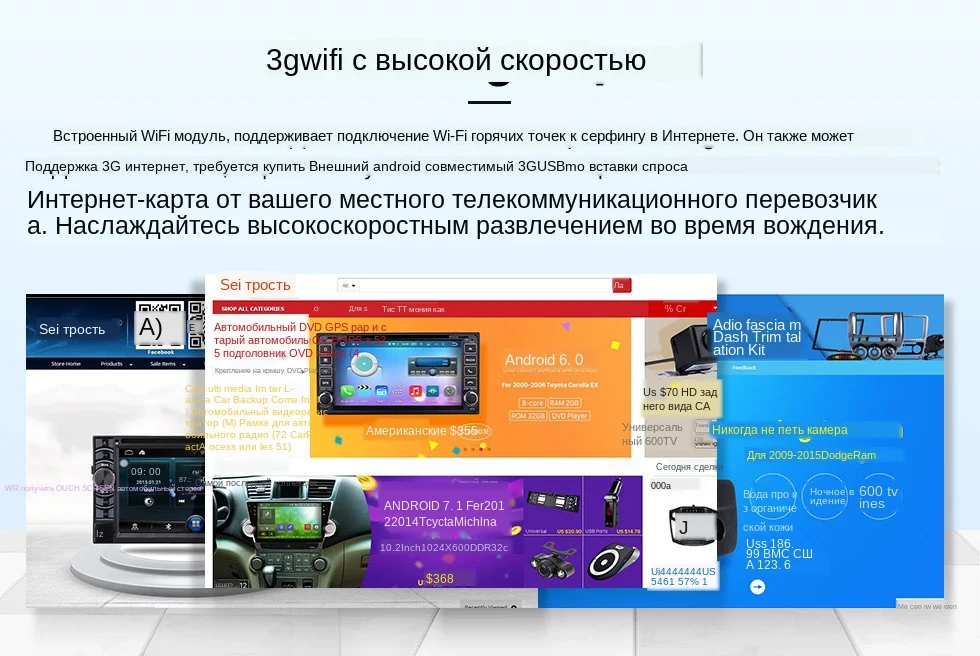 - Высокоскоростной 3G и WiFi Интернет:Система поддерживает интернет-серфинга через 3G или WiFi. Поставляется с WiFi модулем. Вы можете выполнить поиск Google в дороге с помощью коробки быстрого поиска, играть в онлайн-игры, смотреть видео, загружать онлайн-данные и проверять электронные письма, Подключаясь к любой точке доступа Wi-Fi в диапазоне или 3g в Интернете.
