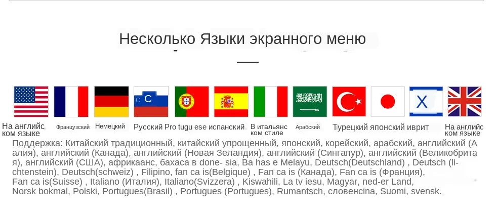 - Языки OSD:Поддерживаются 37 видов языков OSD, включая: Китайский традиционный, китайский упрощенный, японский, корейский, арабский, английский (Австралия), английский (Канада), английский (Новая Зеландия), английский (Сингапур), английский (Великобритания), английский (США), африкаанс, индонезийский бахаса, бахаса мелаю, немецкий (немецкий), немецкий (Норвегия), немецкий (Германия), филиппинский, Fancais (Belgique), Fancais (Канада), Fancais (Франция), Fancais (Suisse), Italiano (Италия), Italiano (Svizzera), Kiswahili, Latviesu, Magyar, Nederland, Norsk bokmal, Polski, portugues (Бразилия), Portugues (Португалия), Rumantsch, словенцина, Suomi, svensk, Pyccknn.