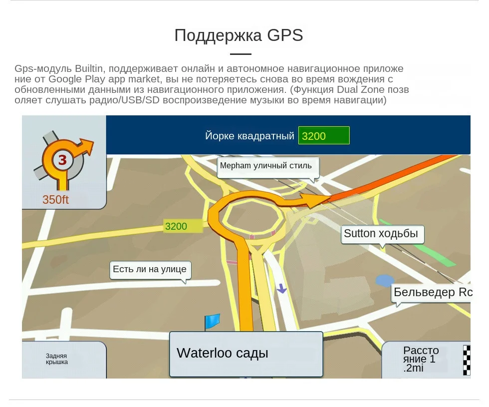 - 3D навигация:Автомобильный стерео оснащен во всем мире функцией навигации в реальном времени высокой точности. Благодаря текущему местоположению, скорости, пробегу, знаковому дисплею здания, 3D виду улицы, поиску места назначения и поворотным голосовым указаниям, он станет вашим идеальным спутником. С функцией двойной зоны, музыка с радио/AV/DVD/TV и т. Д. Может воспроизводиться за сценой в режиме GPS, и она автоматически переключается на голос GPS