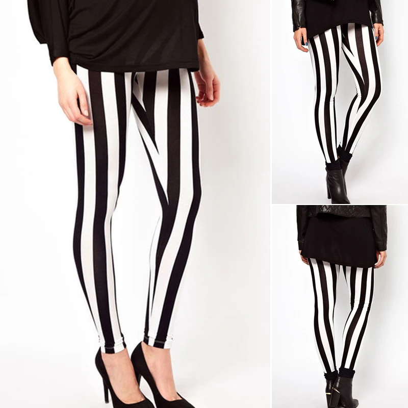 * Описание товара: Модные женские повседневные черно-белые эластичные полосатые Стрейчевые леггинсы длинные брюки