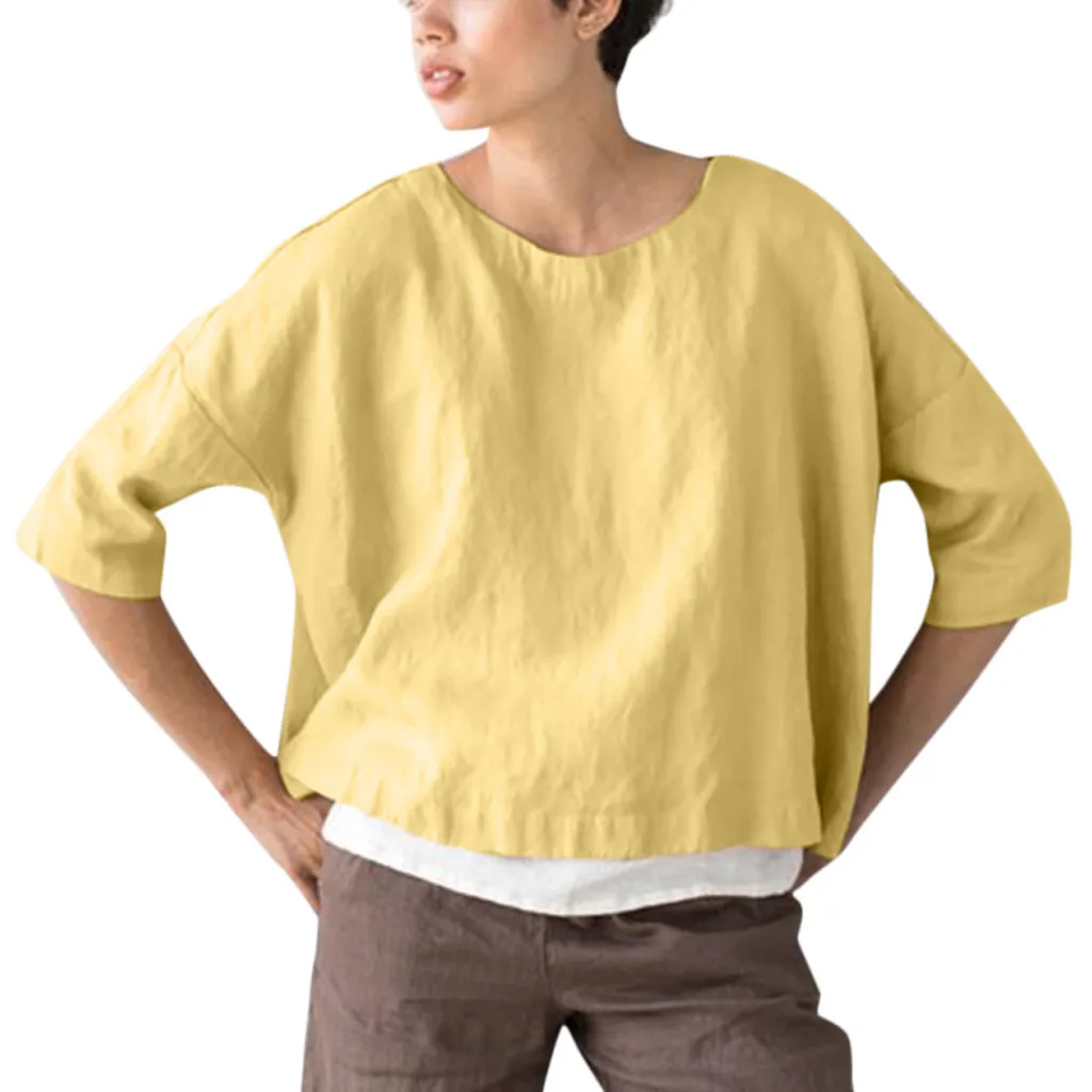 Женские летние повседневные хлопковые льняные свободные топы с круглым вырезом и коротким рукавом, футболка, блузка