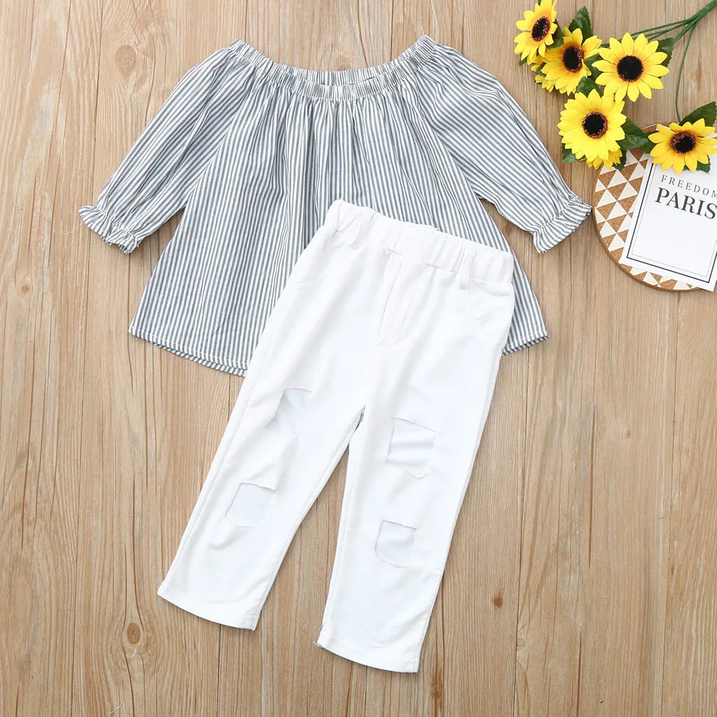 Детские Топы в полоску с открытыми плечами для маленьких девочек, футболка джинсовые рваные штаны, комплект одежды
