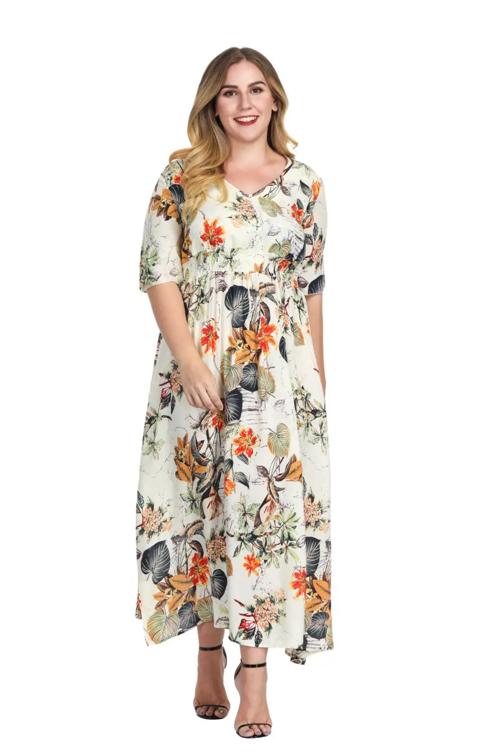 Цветочное летнее платье Бохо плюс размер 5xl 6xl женские пуговицы v-образный вырез с коротким рукавом Макси Длинные платья Тропическое пляжное платье-туника