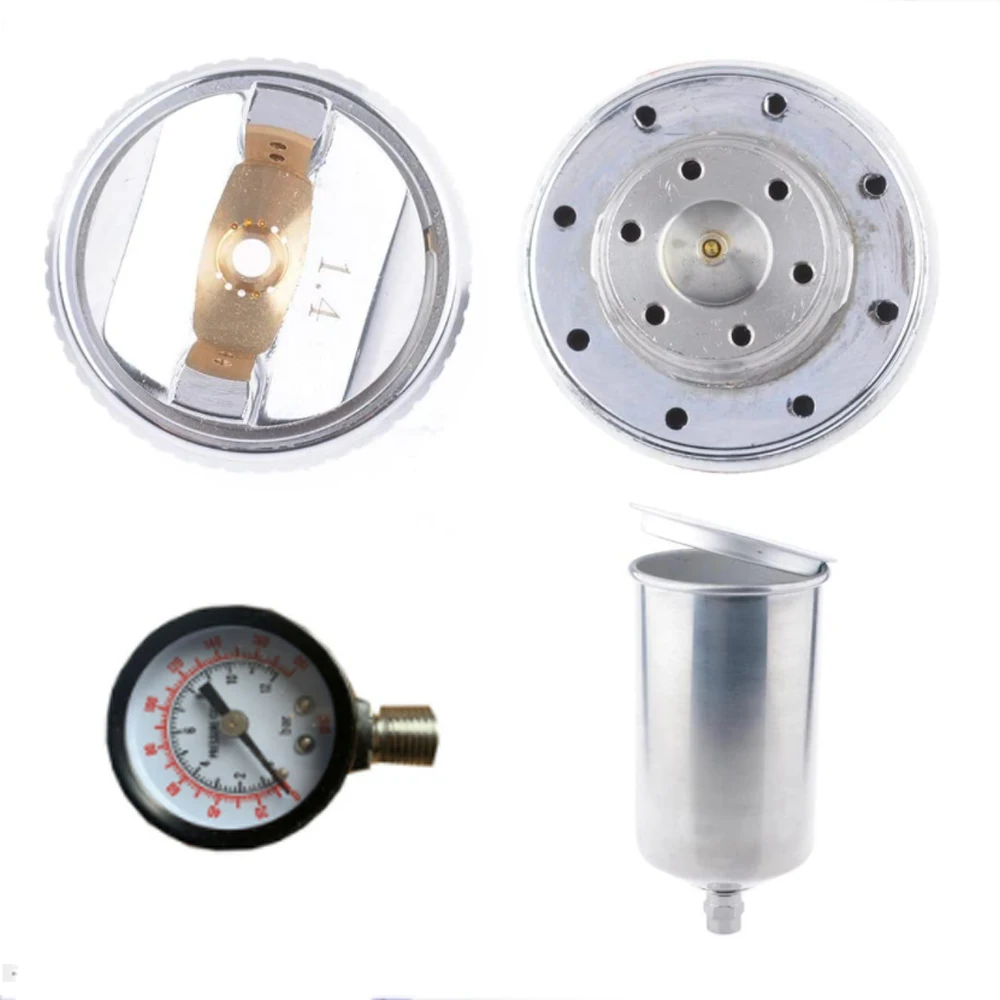 1x HVLP пистолет-распылитель с наконечником жидкости 1x алюминиевая чашка с крышкой 1x истинный микрометр Регулятор воздуха с манометром 1 гаечный ключ 1 комплект винтов 1x щетка 1x фильтры для чашки 1 руководство по эксплуатации (обычно для некоторых моделей)