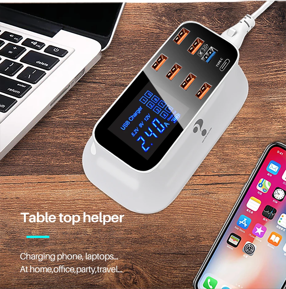 Быстрый просмотр: 1, умный выход соответствия: автоматически индентифицировать устройства и выходной подходящий ток 2, универсальная совместимость: Совместимость со смартфонами, мобильными телефонами, Планшетными ПК, цифровыми камерами, MP3,MP4 и т. Д. 3, монитор отображения в режиме реального времени: светодиодный дисплей показывает вам состояние зарядных устройств в реальном времени, выходной ток каждого рабочего порта, напряжение. Соответствующий номер порта на экране загорается, когда он работает. 8 портов USB называются от 1-8 на экране, например, когда Вы заряжаете свой мобильный телефон или ipad с портом 8, то загорается цифра 8 на экране. 4, Применимые случаи: дом, офис, ресторан, развлекательные места, такие как mahjong parior, путешествия и другое внутреннее использование. Детальные фотографии: