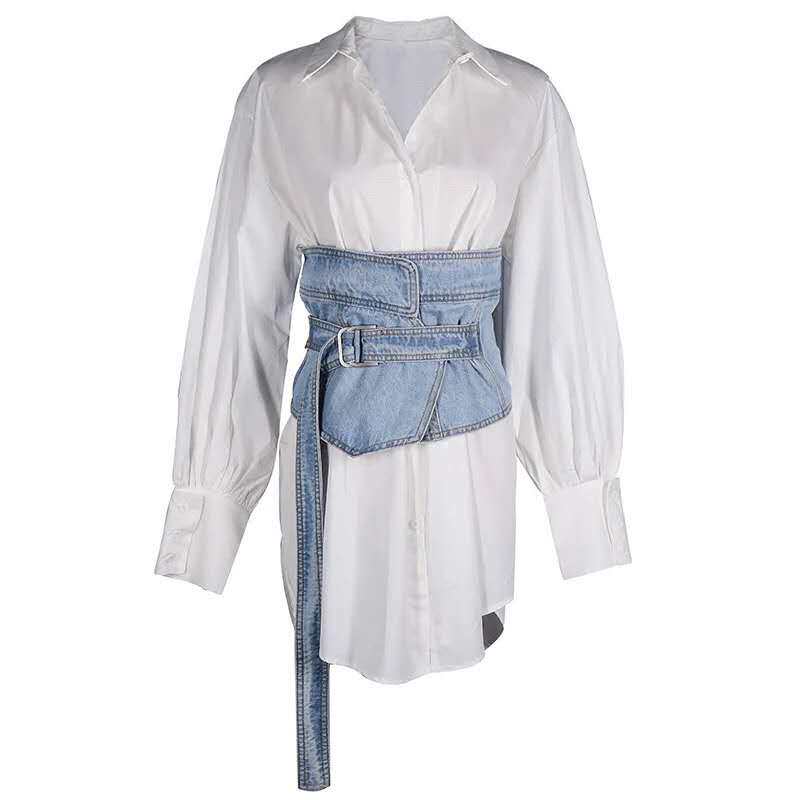 Женское платье-рубашка с рукавами «летучая мышь», белое джинсовое платье с регулируемым поясом, с отложным воротником, весна 2019