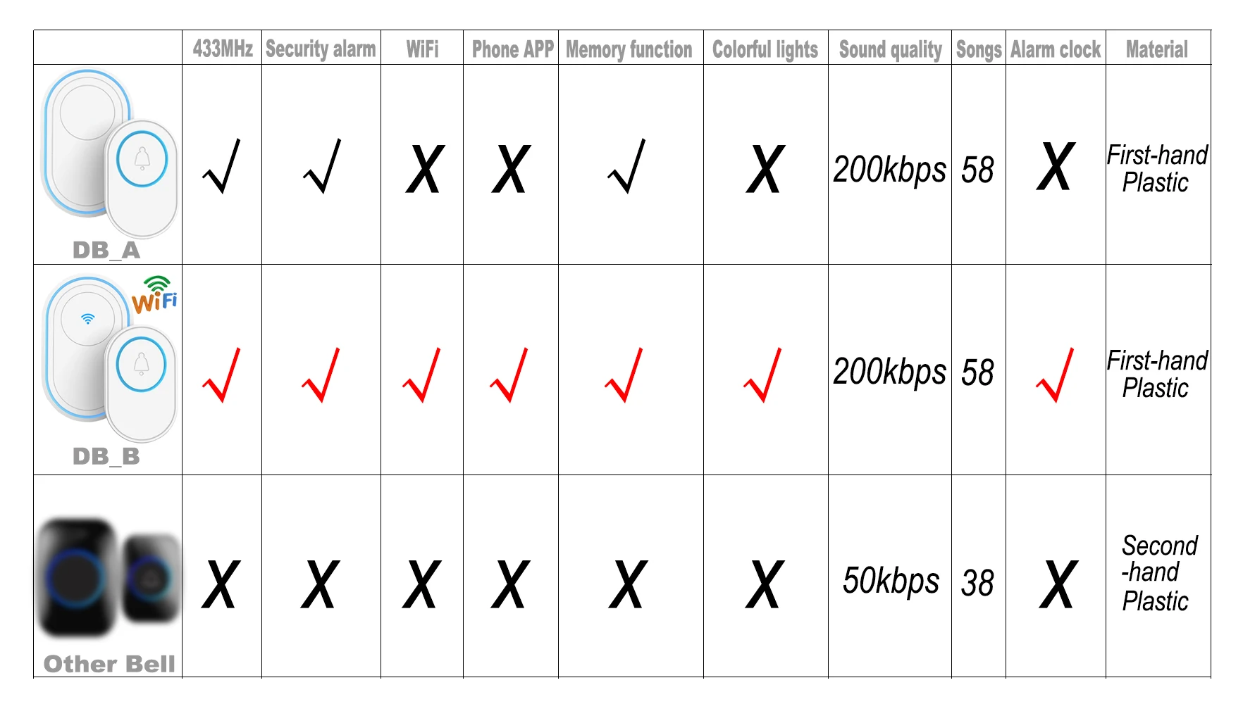 Теплая подсказка: 1. Не только продукт является дверной звонок, но и это домашняя система сигнализации. 2. DB_A1,A2,A3 поддерживает детекторы 433 МГц, но не поддерживает функцию Wi-Fi. 3. DB_B1,B2,B3 поддерживает детекторы 433 МГц, также поддерживает функцию Wi-Fi. Лучшие рекомендации!