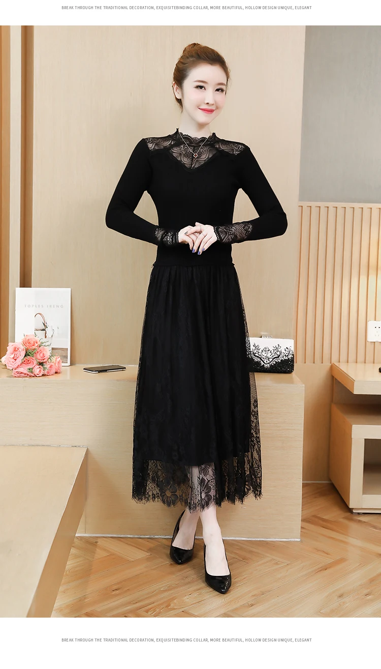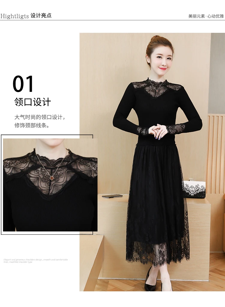 Женское трикотажное платье большого размера 4XL 5XL, черное облегающее кружевное повседневное теплое длинное платье в Корейском стиле на осень и зиму, H111, 2019