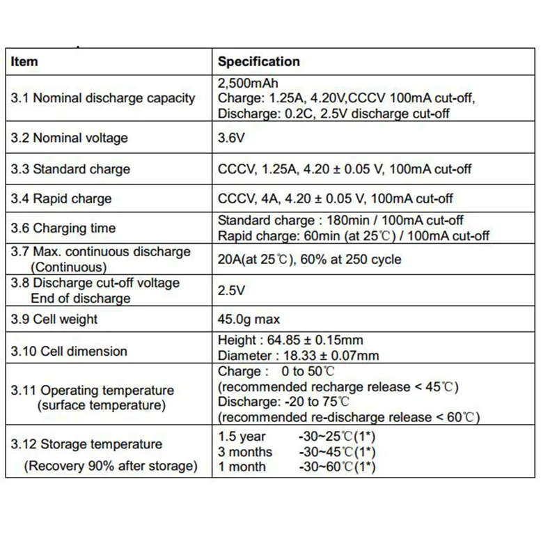 1. Спецификация Бренд: Sam Sung Номинальная емкость разряда: 2500 мАч Номинальное напряжение: 3,6 V Стандартная зарядка: CCCV 1.25A 4,20 ± 0,05 V 100mA отключение Быстрая зарядка: зарядки 4A 4,20 ±. 0,05 V 100mA отрезной Макс. Непрерывный разряд: 20A Критическое разрядное напряжение: 2,5 V Вес ячейки (приблизительно) :45 г Размер ячейки: Диаметр 18,33 ± 0,07 мм high64.85 ± 0,15 мм Рабочая температура: Зарядка: от 0 до 50 ℃, разряд: от-20 до 75 ℃ 2. Модель: Электроинструменты, электрическая дрель, электронные игрушки
