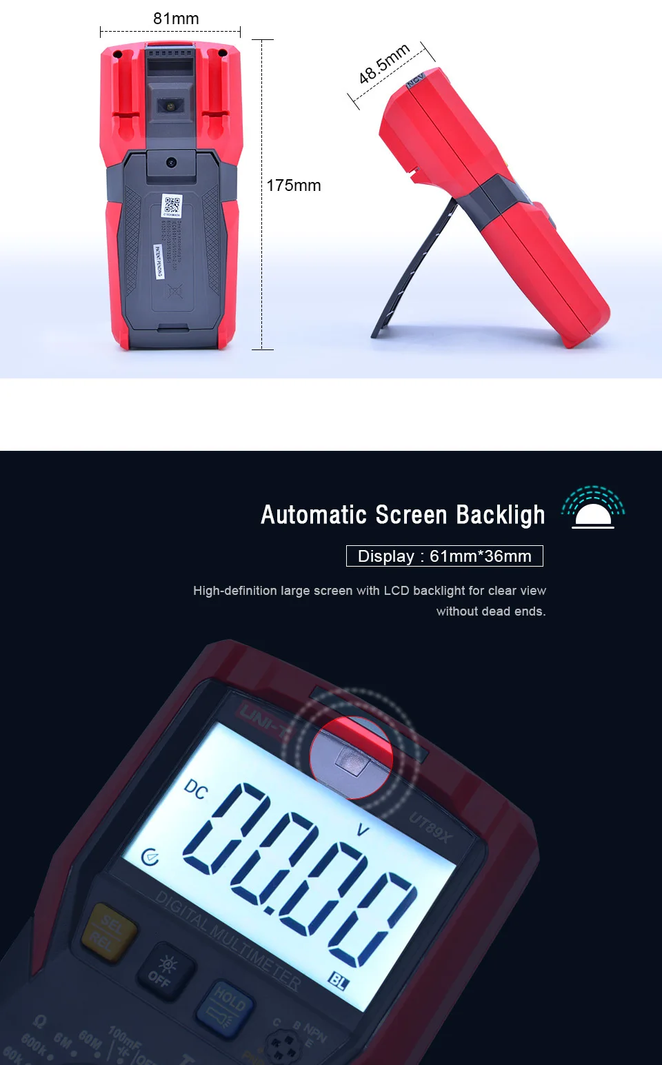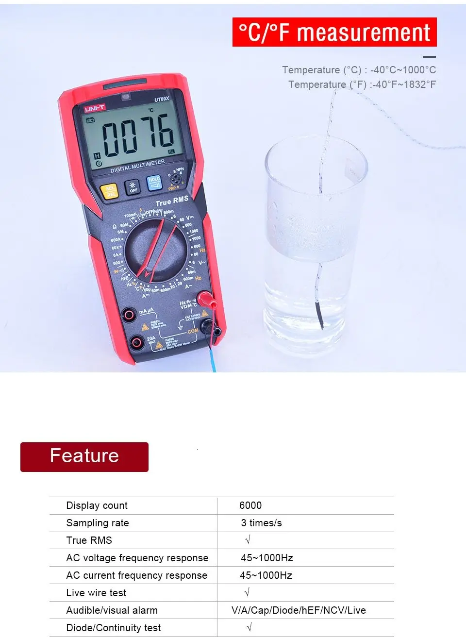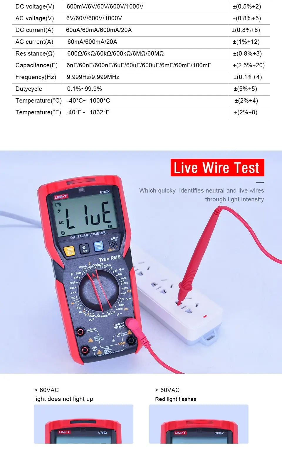 | Звуковой/визуальная сигнализация | V/A/Cap/Diode/hFE/NCV/Live (Только в том случае, UT89X)/Светодиодный(Только в том случае, UT89XD) | |