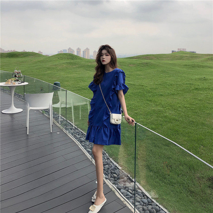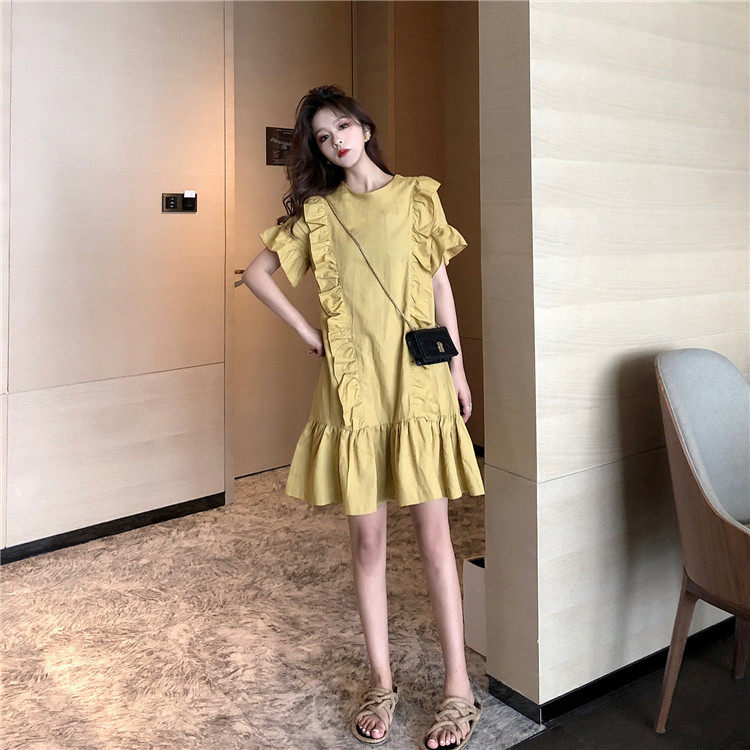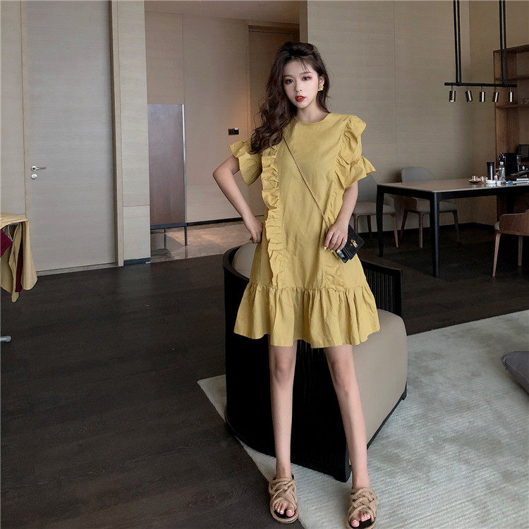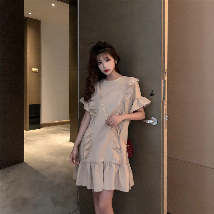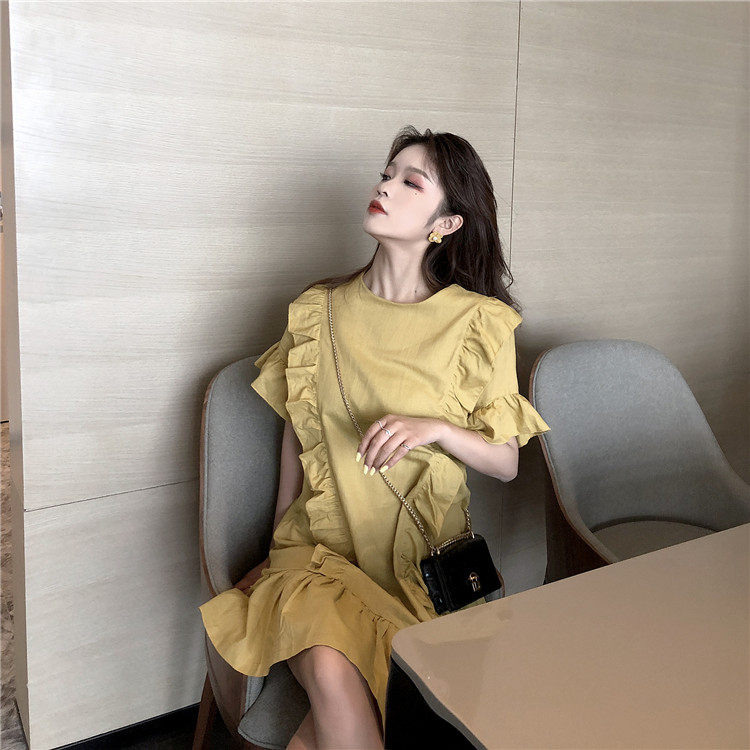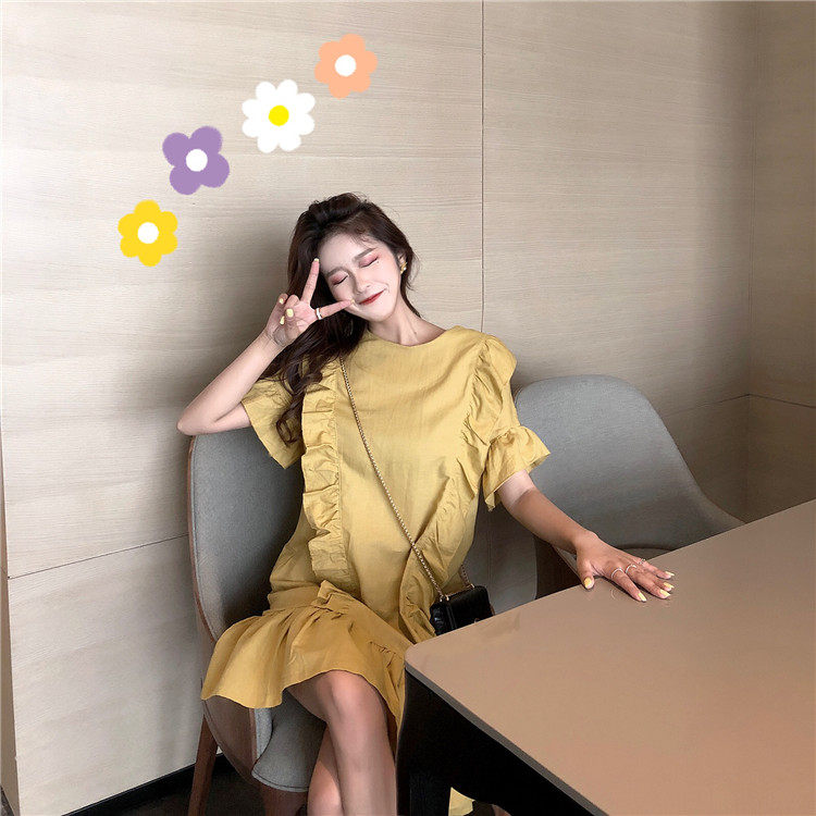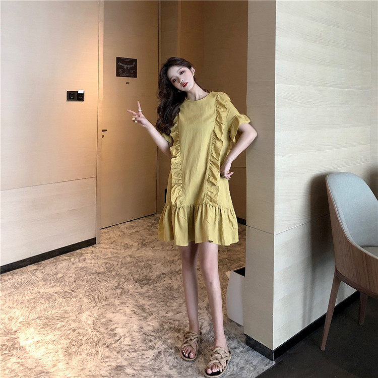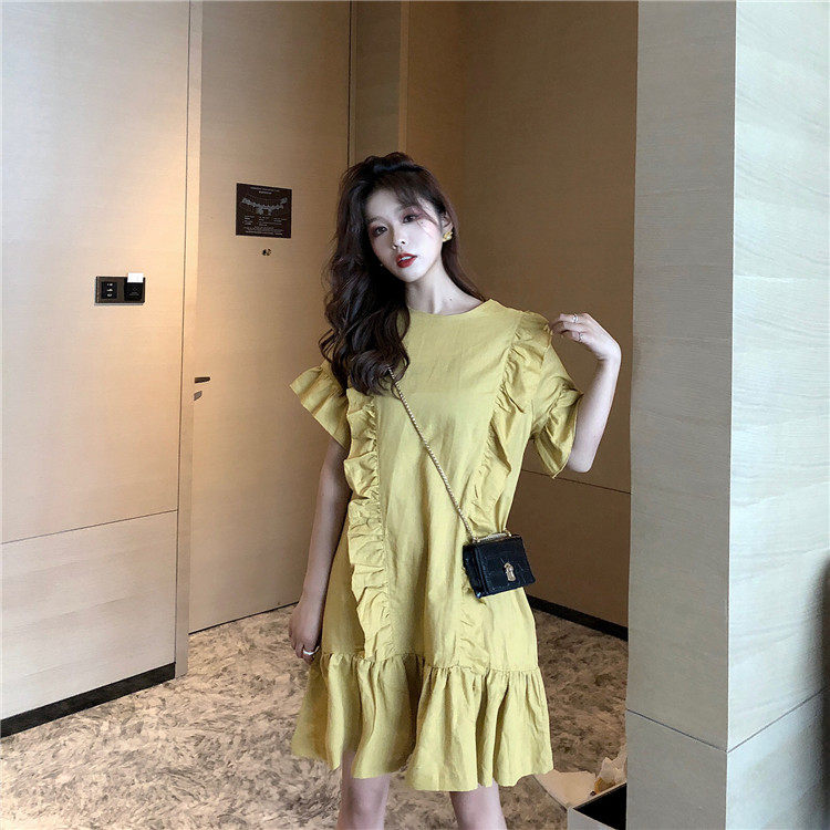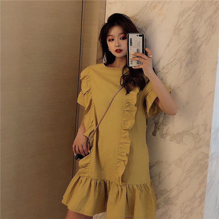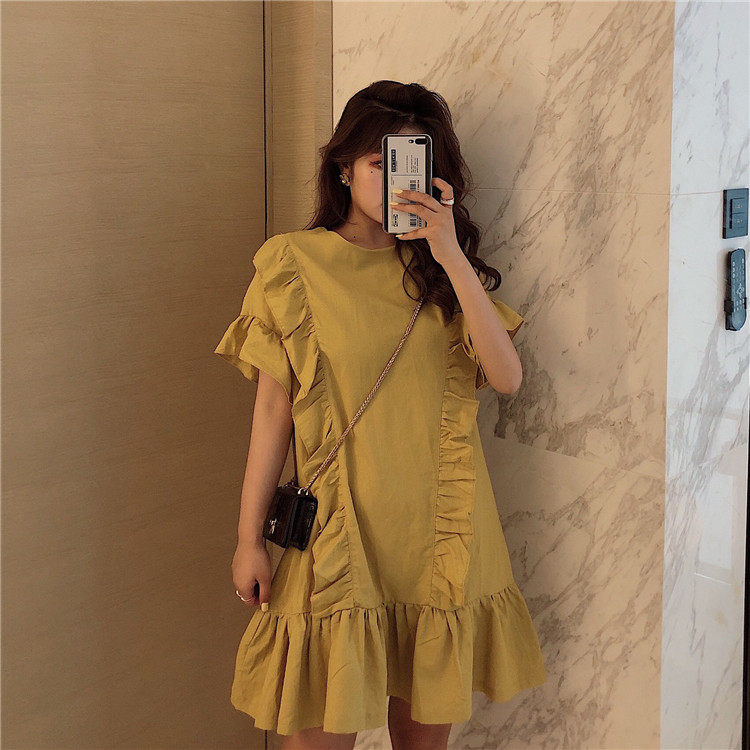 3 цвета летнее платье 2019 корейский ins стиль свободный сплошной цвет с коротким рукавом и оборками длиной до колена платье женское