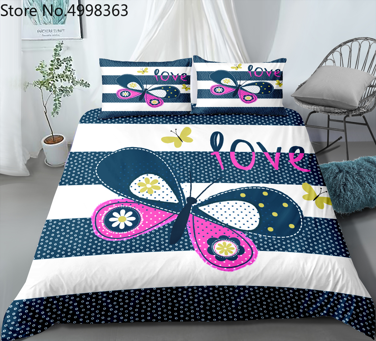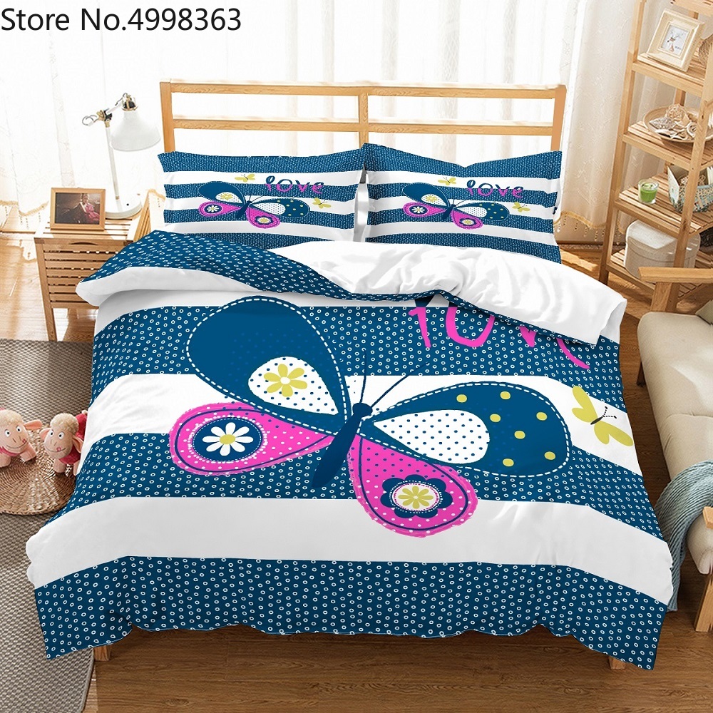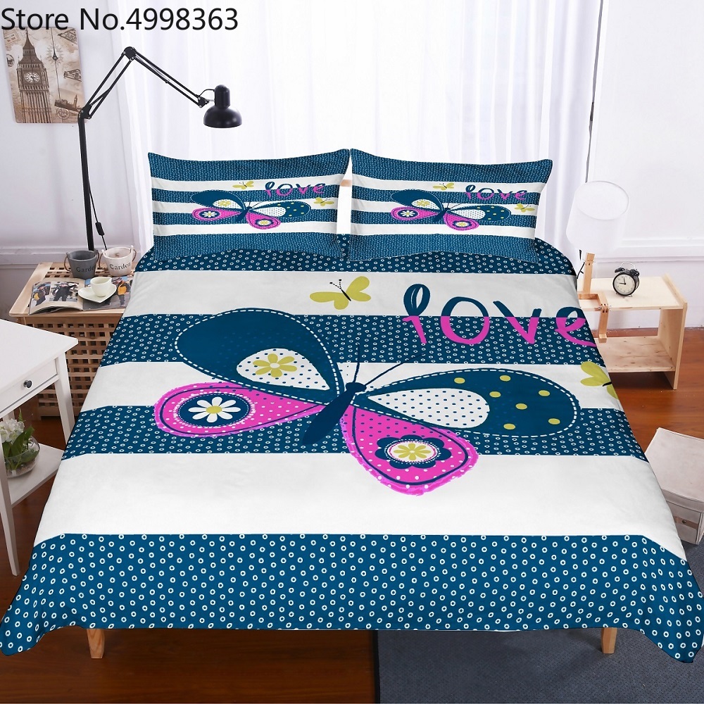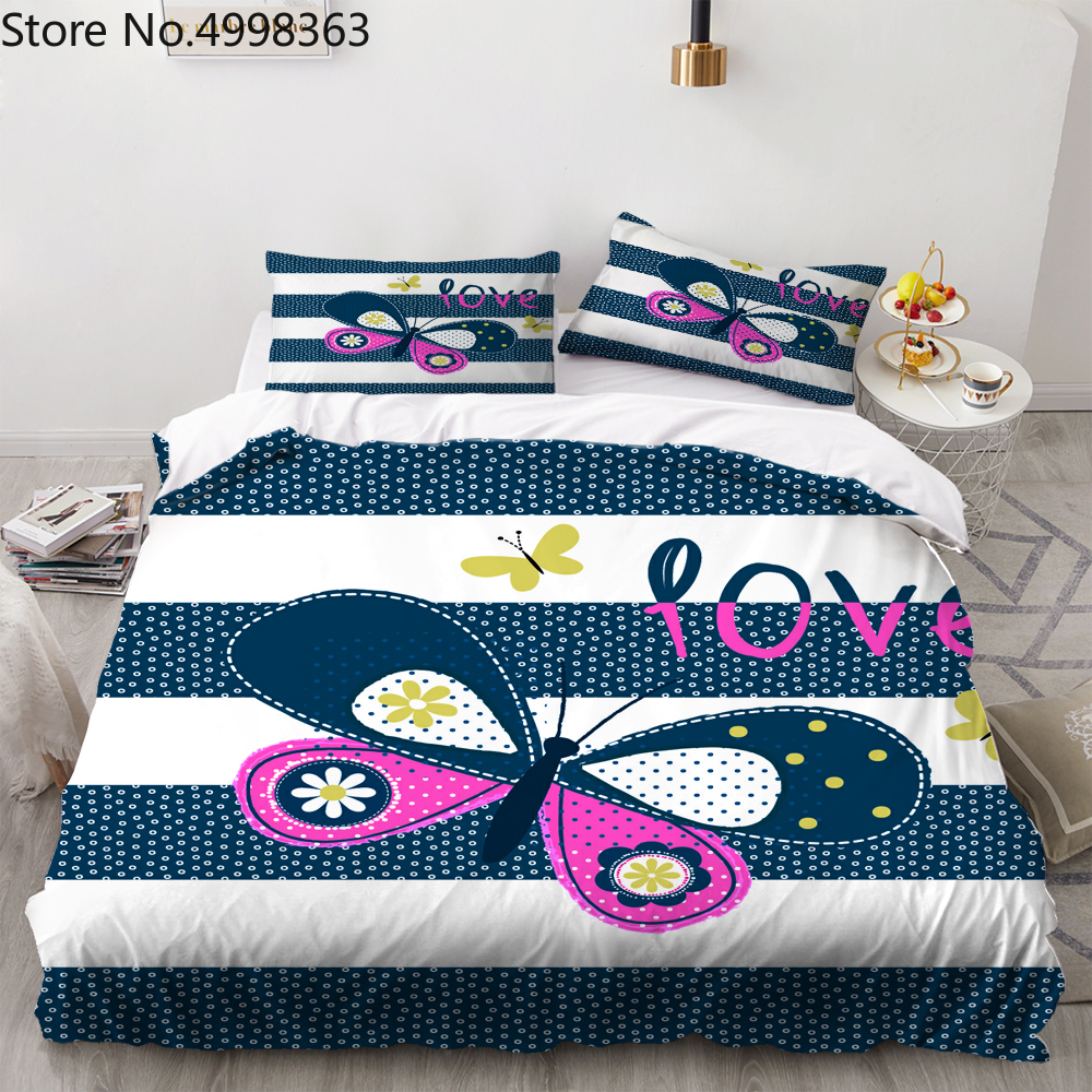 Пользовательские бабочка комплект постельного белья для девочек розового и желтого цвета; Узор «бабочки» и «любовь» пузыри в полоску белого и синего цвета Постельное белье 2/3 шт. Комплект постельного белья