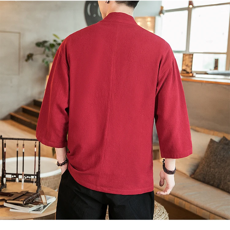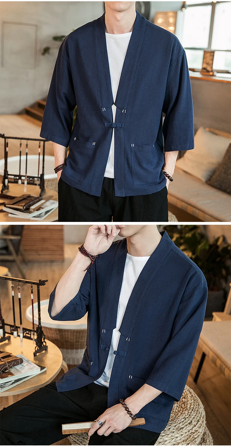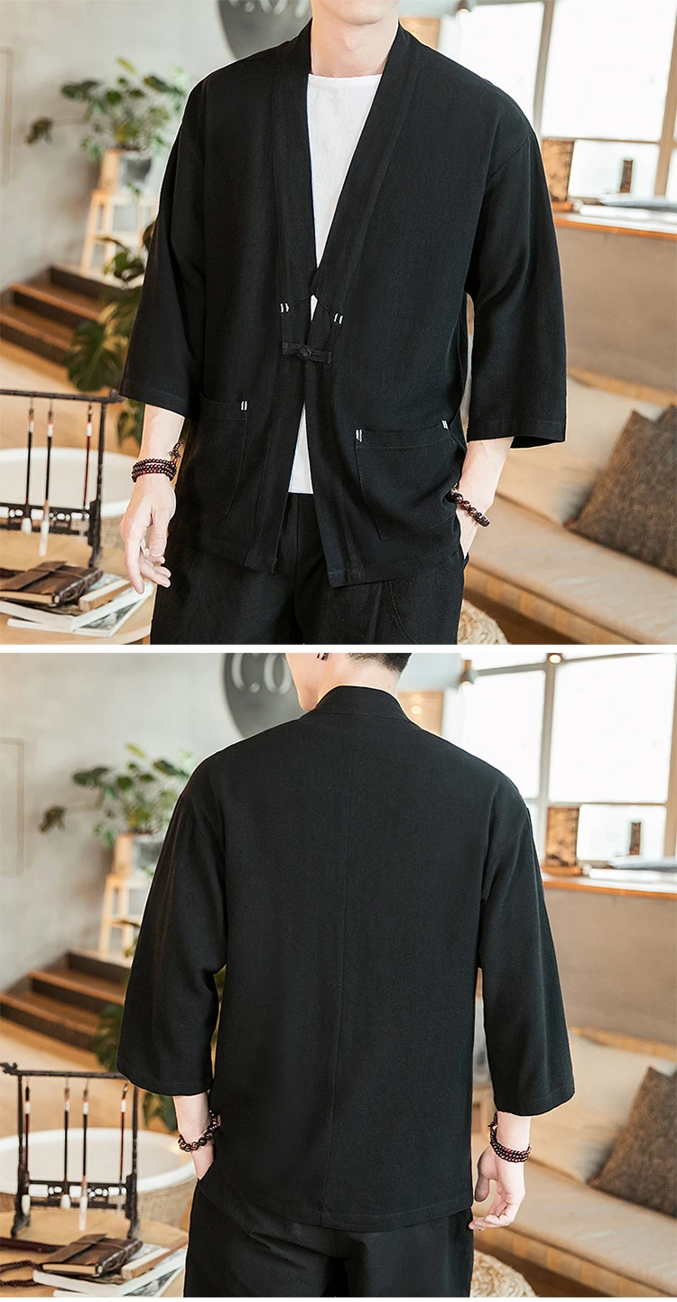 #4307 Весна черный красный синий однобортный винтажное льняное кардиган кимоно