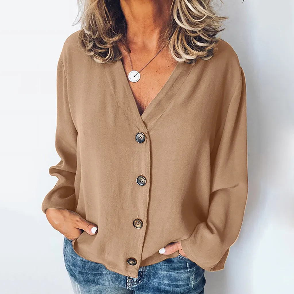 Женская блузка с длинным рукавом Feitong, повседневная однотонная Свободная рубашка с v-образным вырезом и пуговицами, женская блузка