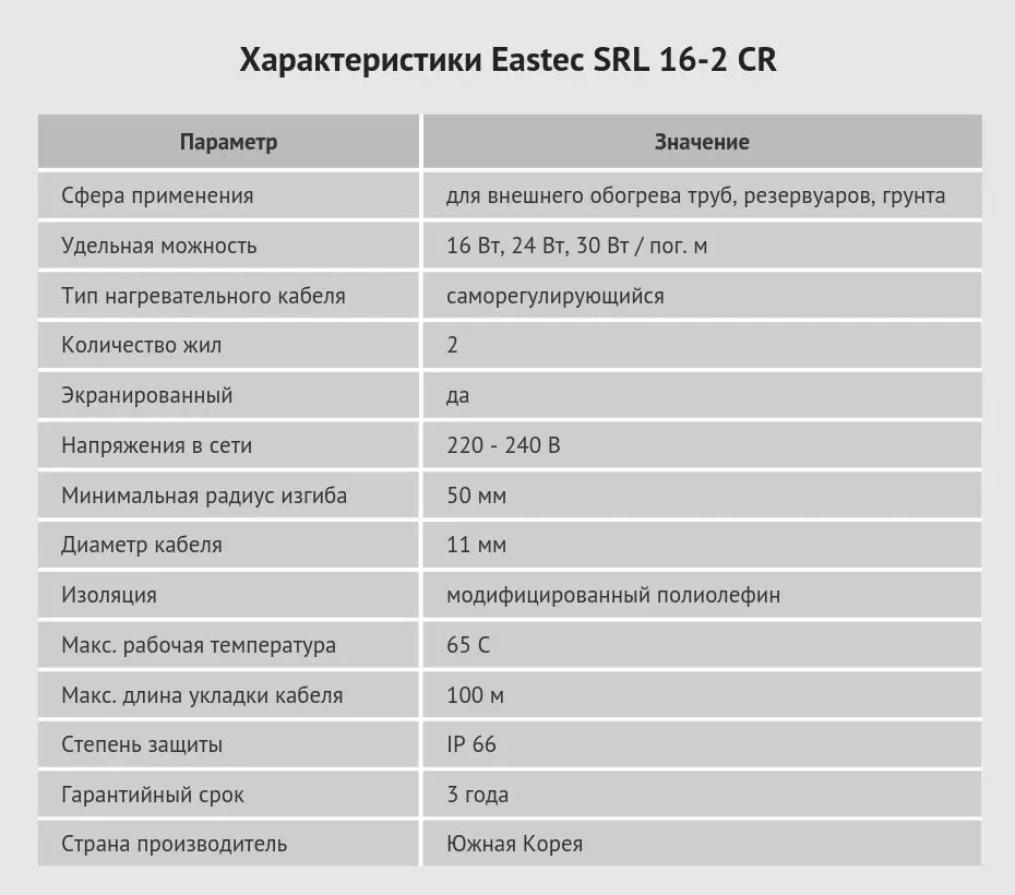 Температура нагрева кабеля до 65 градусов. Потребляемая мощность на 1 метр - 16 Вт, 24 Вт, 30 Вт. Подключение к домашней сети 220 Вольт.