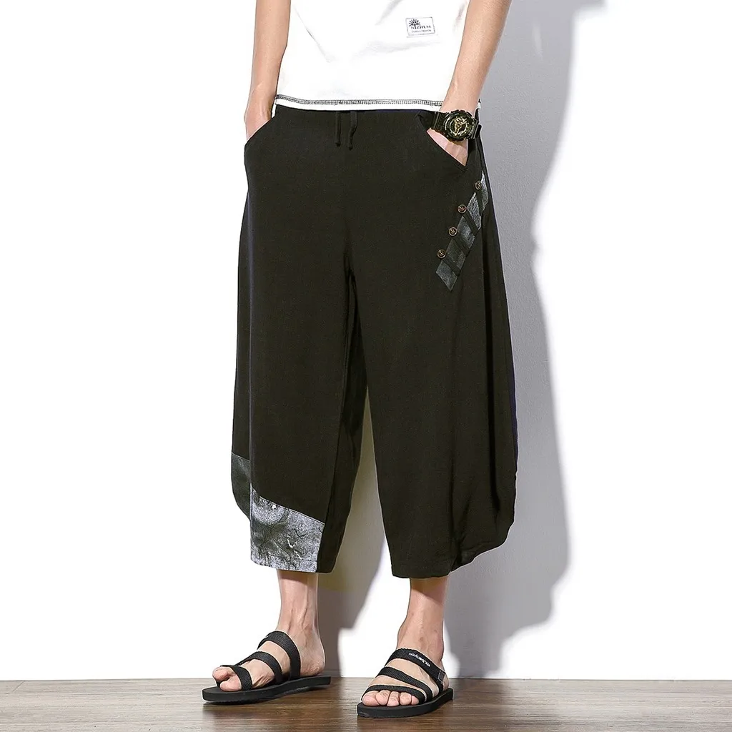 Мужские повседневные тонкие спортивные брюки до середины икры, льняные брюки, мешковатые шаровары