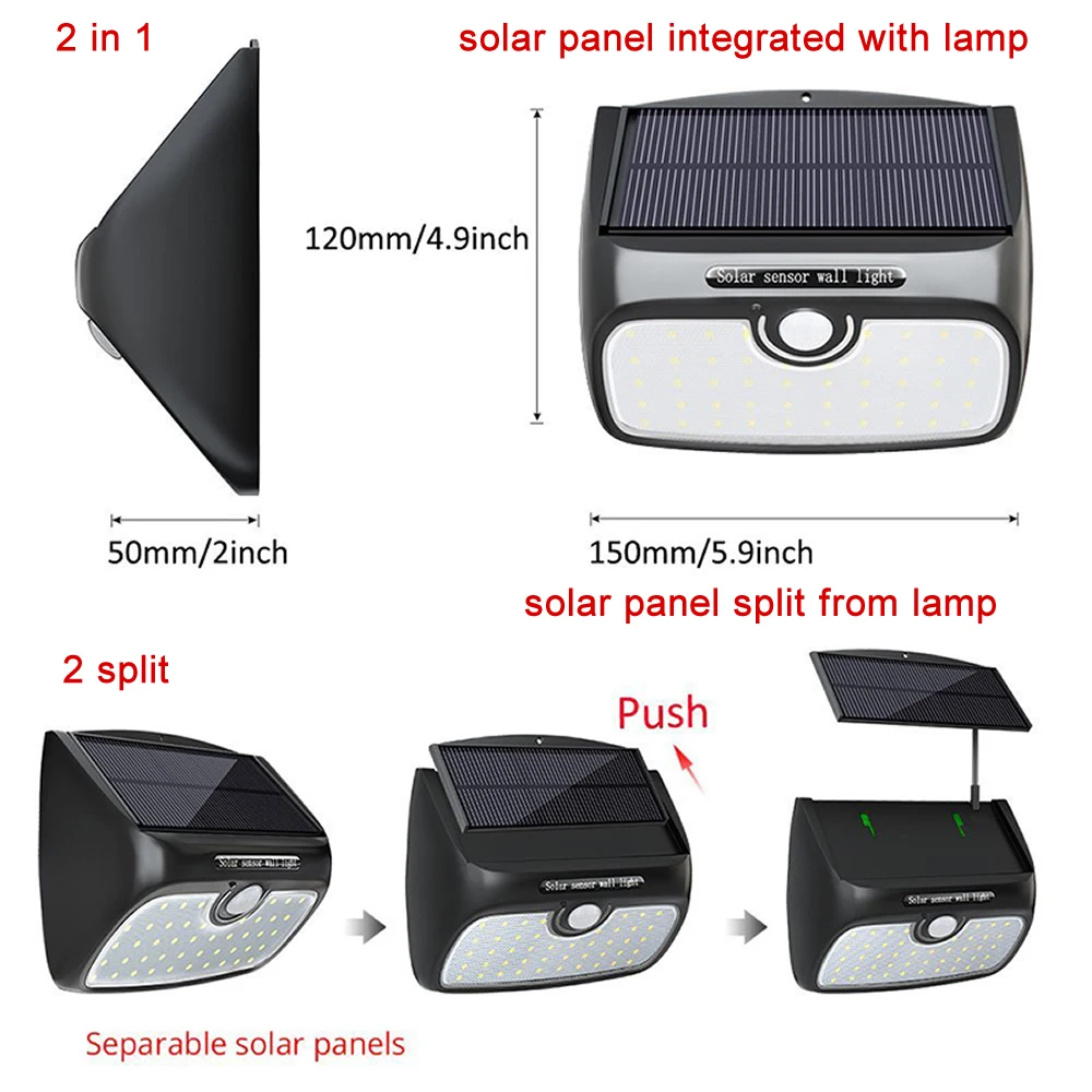 Обновление 48 светодиодов Солнечный светодиодный свет вместо 38 светодиодов 28 светодиодов Солнечный свет подходит для короткой зимы с длинным солнечным светом, сплит-дизайн позволяет использовать в помещении и т. Д., солнечная панель устанавливается снаружи с сильным солнечным светом и лампой 2,5 м вдали от солнечной панели, беспроводной, не требуется провод Спецификация