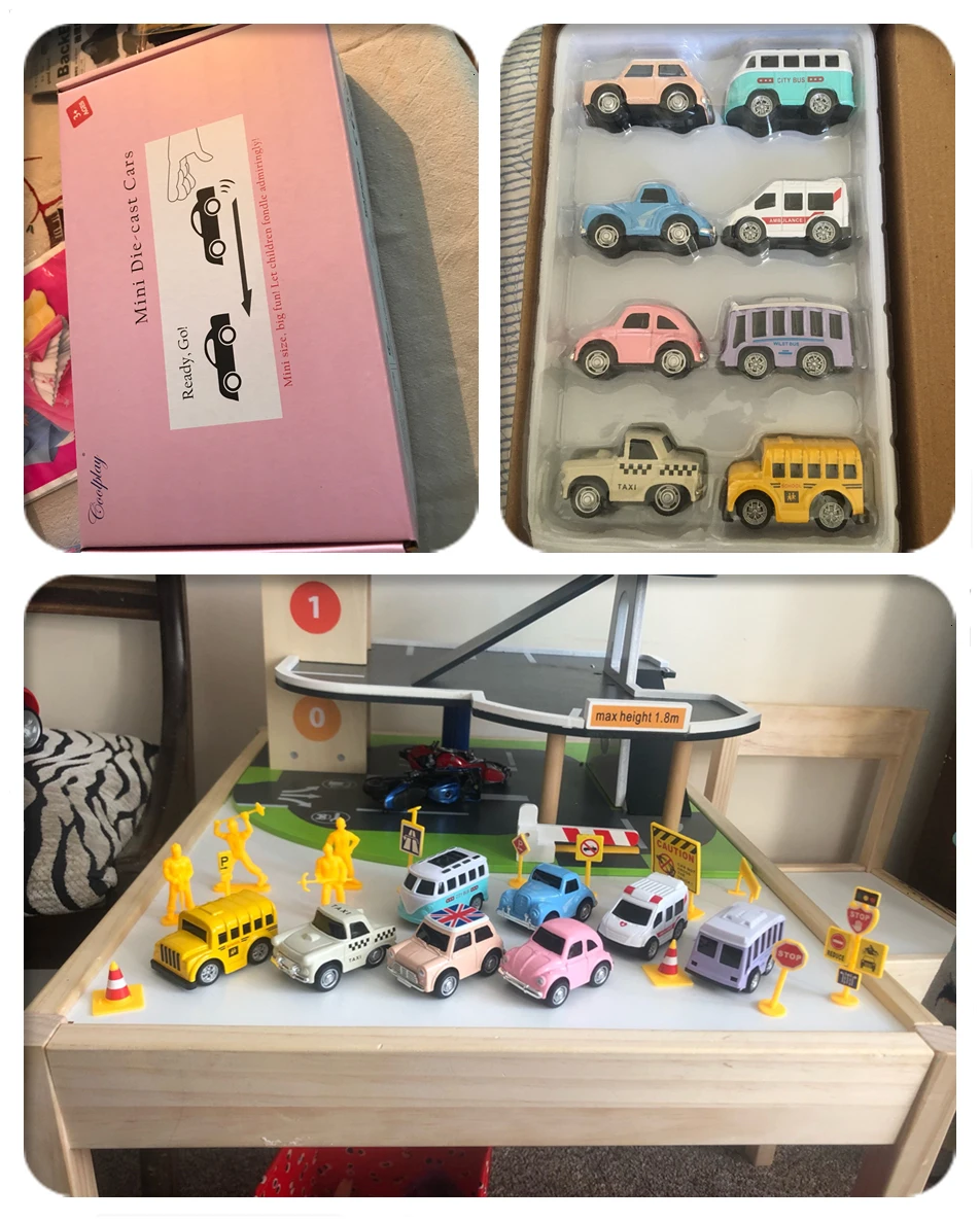 Посылка включает в себя: 1 комплект мини-симпатичная модель автомобиля из сплава (8 шт.)