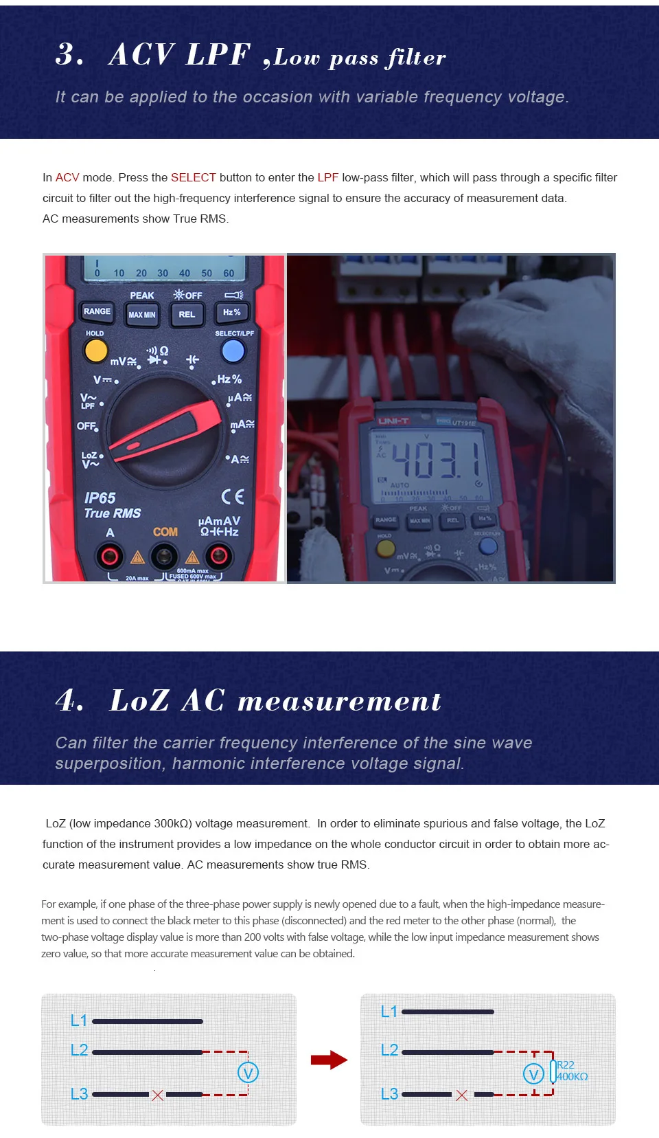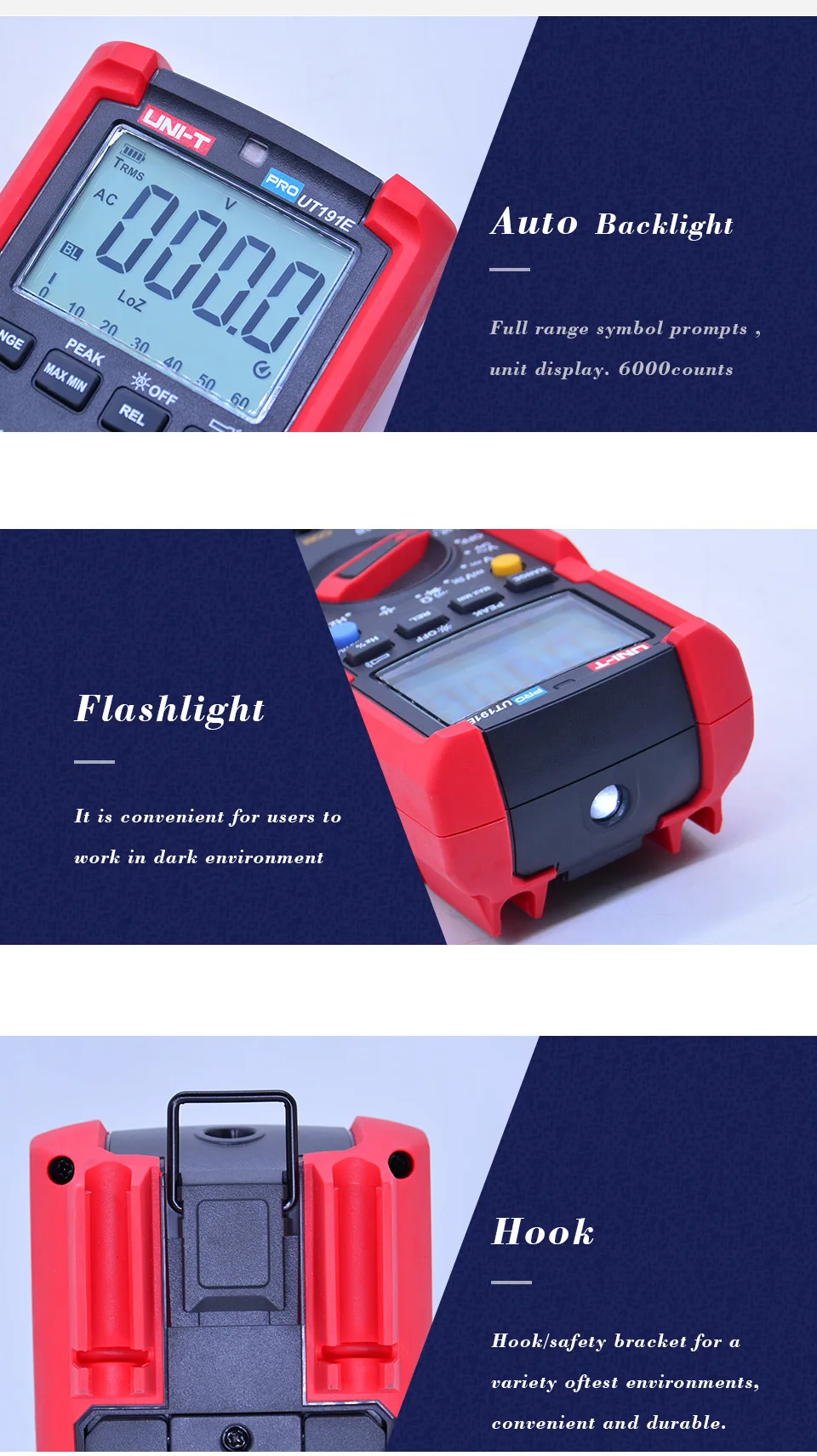 UT191 серия профессиональных мультиметров предназначена для промышленных пользователей. Этот сертифицированный мультиметр серии CE/GS/cTUVus соответствует стандарту CAT III 600V и имеет класс IP65, подходит для использования во влажной и пыльной среде. UT191's new function Memory сохраняет последние настройки режима в следующий раз, когда он включен, улучшая эффективность для пользователей.