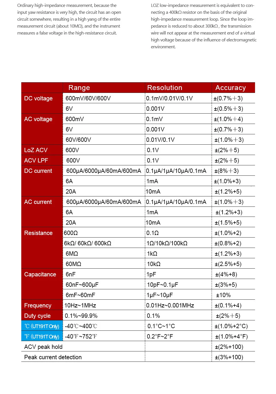 | Температура (°) (Только UT191T) | -40°~ 400° | 0,1 °C ~ 1 °C | ±(1.0% + 2 °C) |