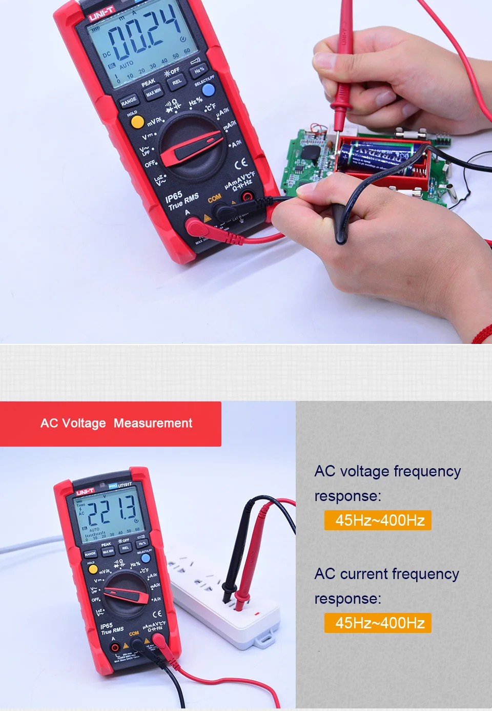 UT191 серия профессиональных мультиметров предназначена для промышленных пользователей. Этот сертифицированный мультиметр серии CE/GS/cTUVus соответствует стандарту CAT III 600V и имеет класс IP65, подходит для использования во влажной и пыльной среде. UT191's new function Memory сохраняет последние настройки режима в следующий раз, когда он включен, улучшая эффективность для пользователей.