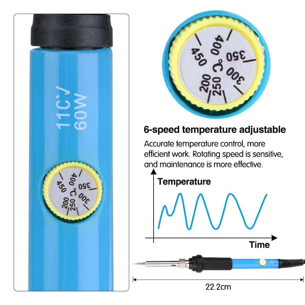 Паяльники с регулируемой температурой: 200-450 °C, установите желаемое значение для удовлетворения ваших потребностей в пайке.