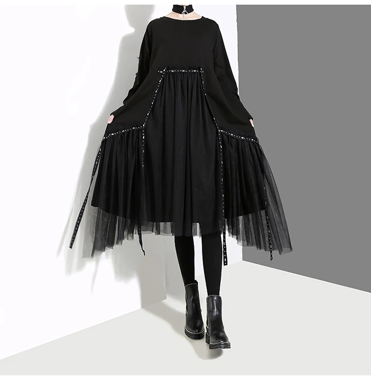 Новинка, большие размеры, Женское зимнее однотонное черное Свободное платье, длинный рукав, сетка, наложение ленты, Дамское повседневное стильное платье миди, женское платье 4564