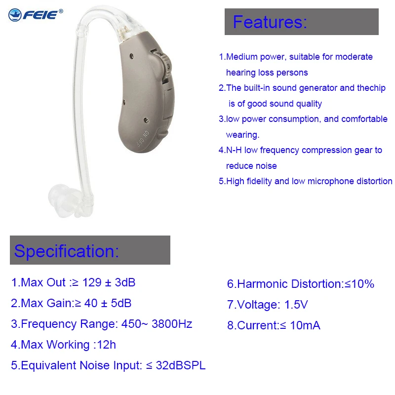 Особенности: | 1. Средняя мощность, подходит для людей с умеренной потерей слуха 2. Встроенный звуковой генератор и thechip хорошего качества звука 3. Низкое энергопотребление и комфортное ношение. 4.N-H низкочастотный компрессионный механизм для снижения уровня шума 5. Высокая точность и низкое искажение микрофона | ||