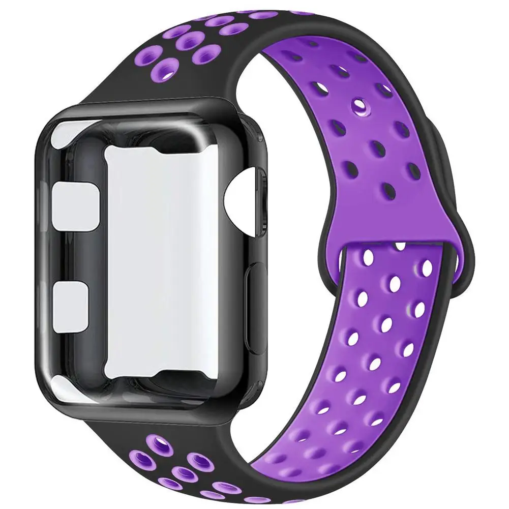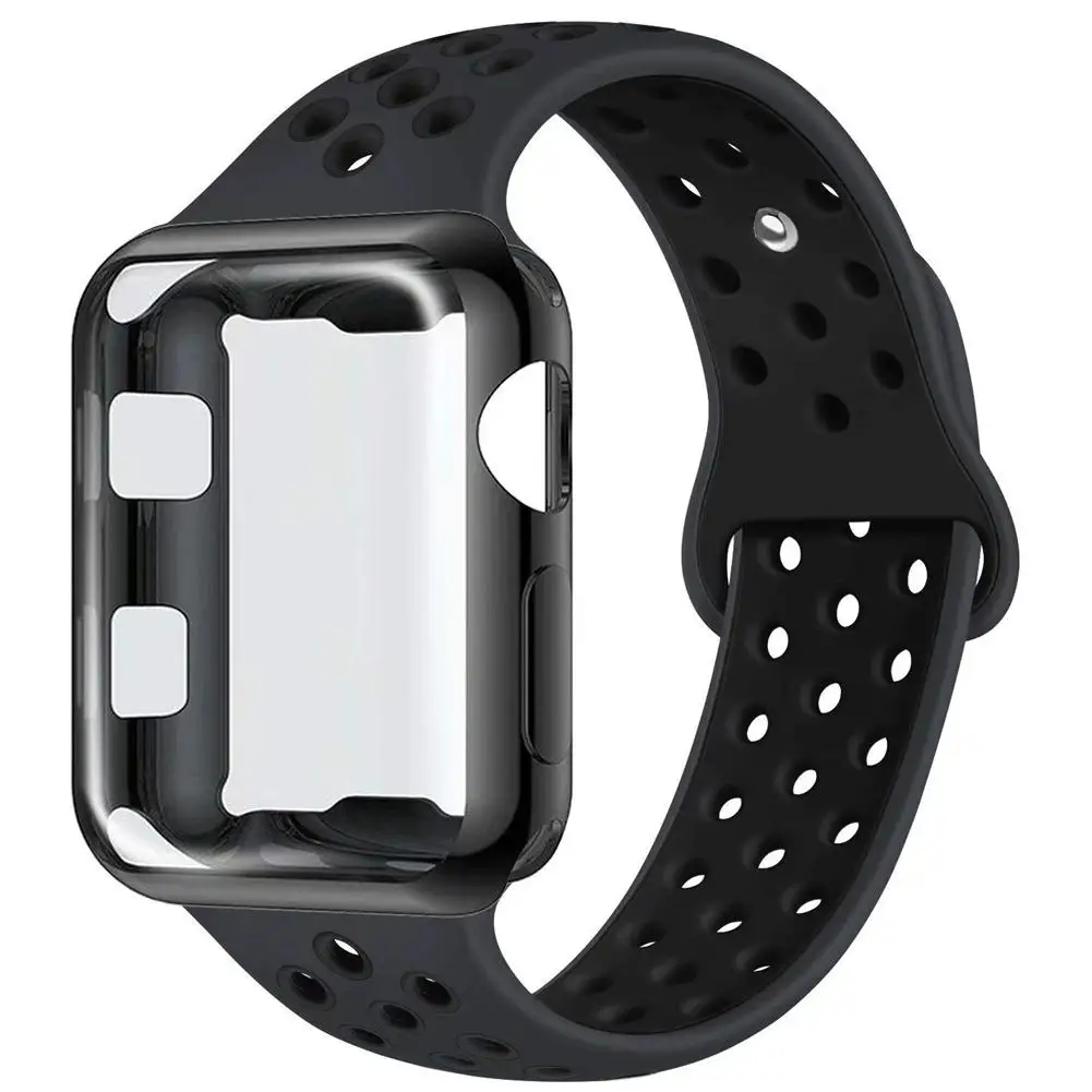 2. Силиконовый ремешок с чехлом подходит для Apple Watch серии 4/3/2/1. Ремешок изготовлен из высококачественного силикона, легкий, удобный, дышащий и имеет отличные ощущения от руки. Спортивный ремень iwatch отличается высокой прочностью и износостойкостью, пыленепроницаемостью, водонепроницаемостью и защитой от пота.