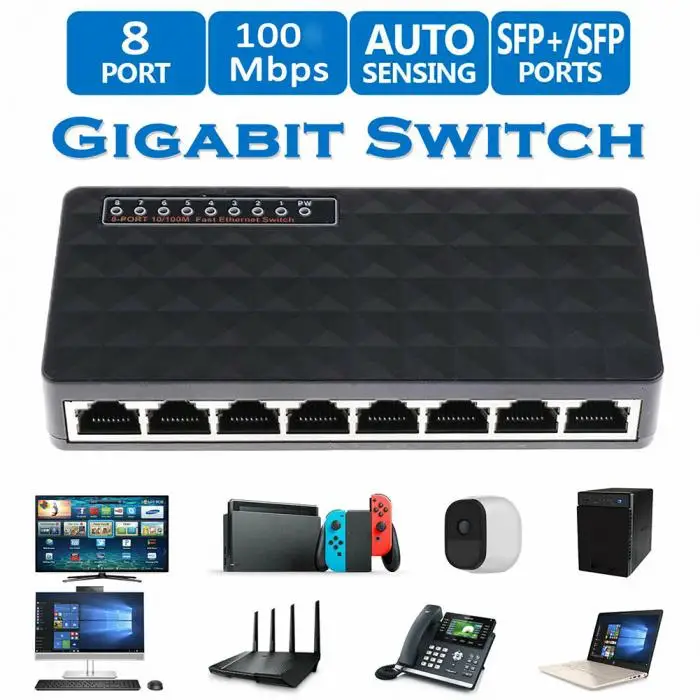 8-портовый коммутатор Ethernet соединяет 10/100 Мбит/с.