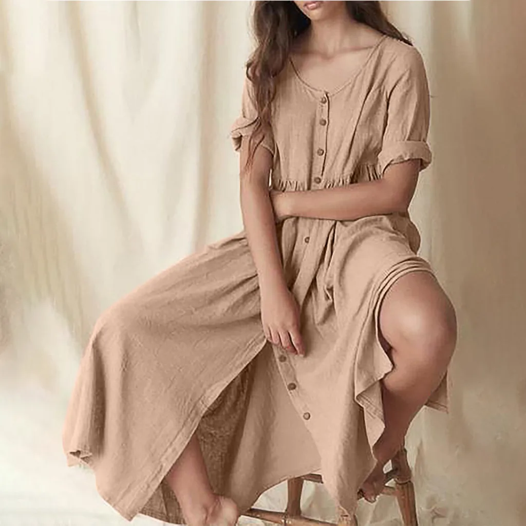 Модный женский однотонный кардиган на пуговицах с круглым вырезом, легкое хлопковое и льняное платье