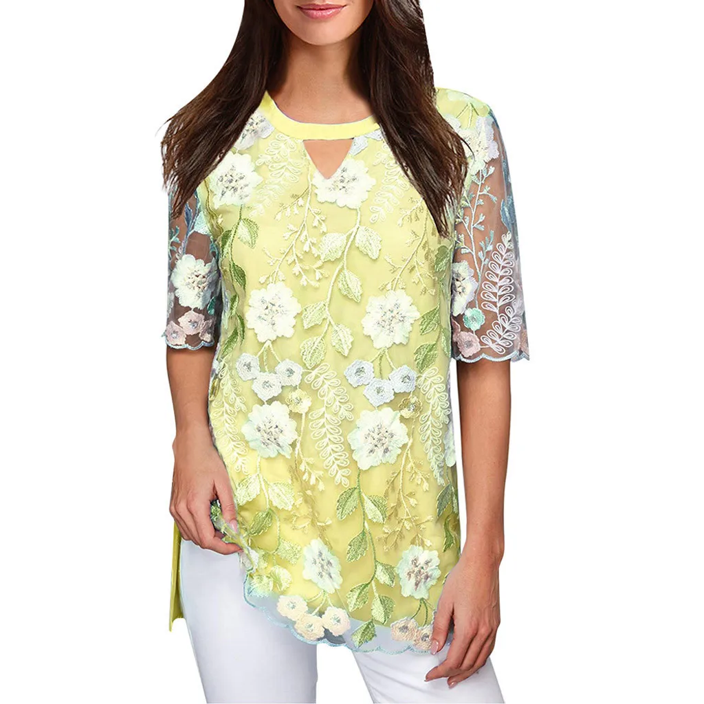Женская Повседневная рубашка с круглым вырезом, шифоновая блузка с вышивкой