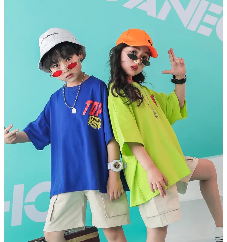 Джазовый танцевальный костюм для девочек и мальчиков; Футболка большого размера; Детская одежда в стиле хип-хоп; Хлопковые рубашки; Брюки для бальных танцев; Одежда