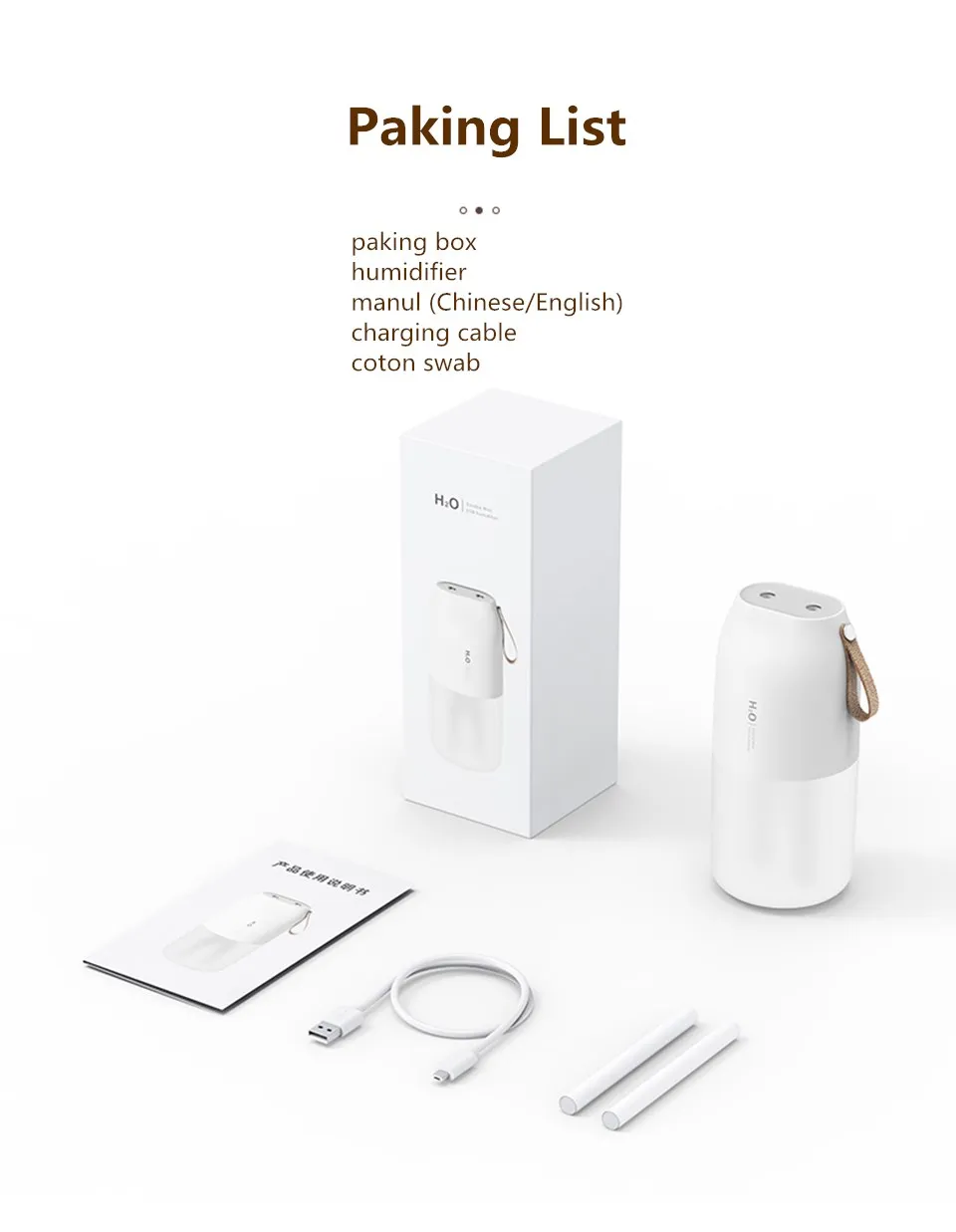 1. Применение usb-кабель для conenct увлажнитель с источник питания для зарядки около 3,5 H.